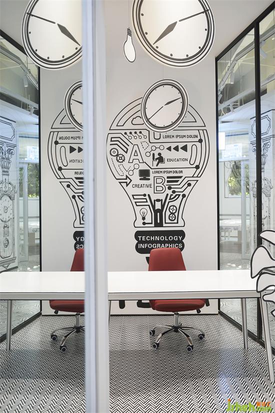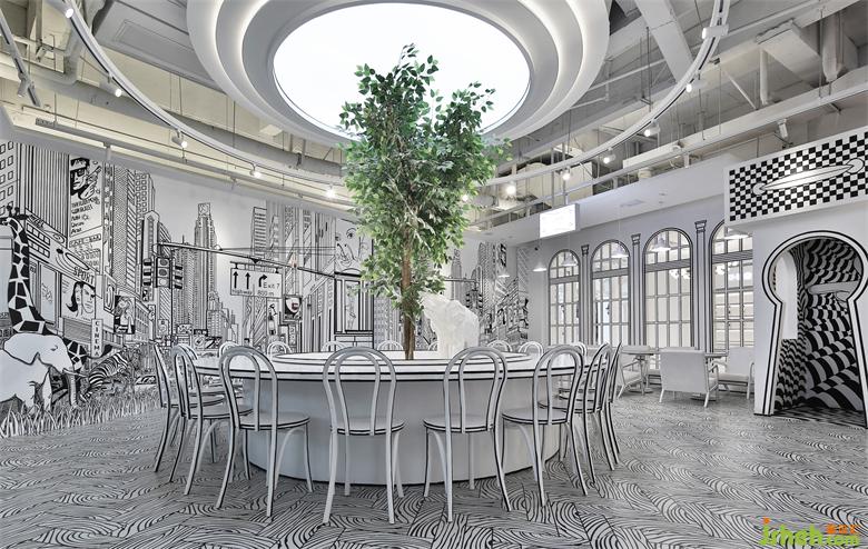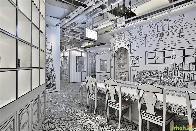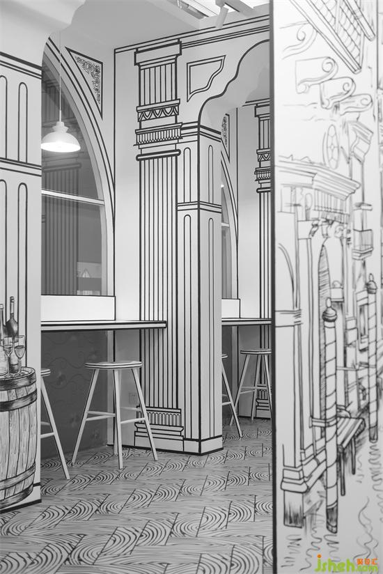 在家具軟裝配飾的設(shè)計上,咖啡館設(shè)計設(shè)計師也花費了很多小心思,特別是桌椅板凳,用黑色手繪的線條勾勒出桌子、椅子,繪制上不同的圖案線條,在窗戶一些的細(xì)節(jié)上也如法炮制,咖啡館設(shè)計塑造出一種平面的感覺。