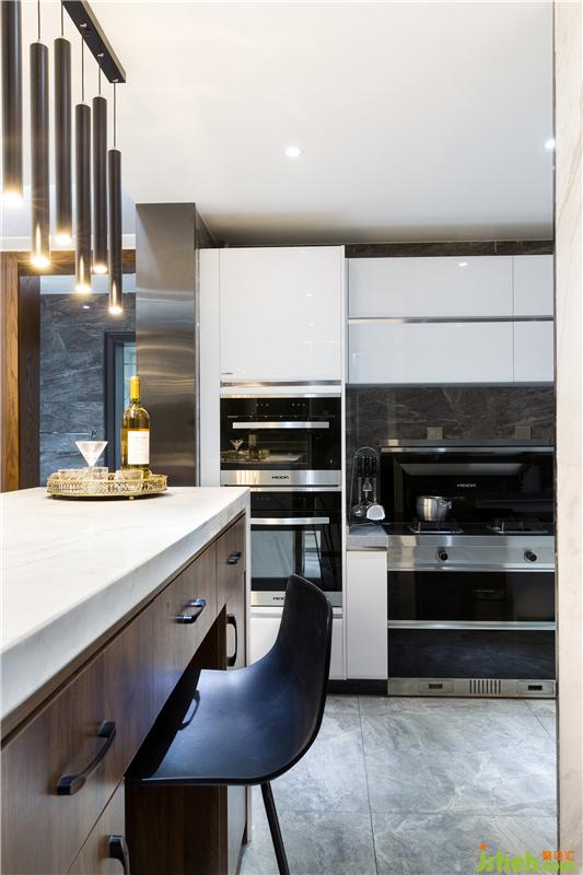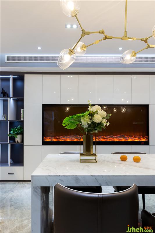 餐廳的整體色調(diào)基本與客廳協(xié)調(diào)統(tǒng)一,背景墻區(qū)域同樣是采用大面積的白色,亮點之處則是以溫暖的壁爐作為視覺中心,木質(zhì)的餐邊柜與大理石質(zhì)感的餐桌相互協(xié)調(diào),線條流暢簡單,空間色彩上更為活潑、生動。餐邊柜的區(qū)域設(shè)計的吧臺,便于男女主人平日里小酌,也更多了些慵懶放松感,暖光直接投射于餐桌的金屬餐具之上,體現(xiàn)出一種精致高貴的生活環(huán)境。室內(nèi)設(shè)計師