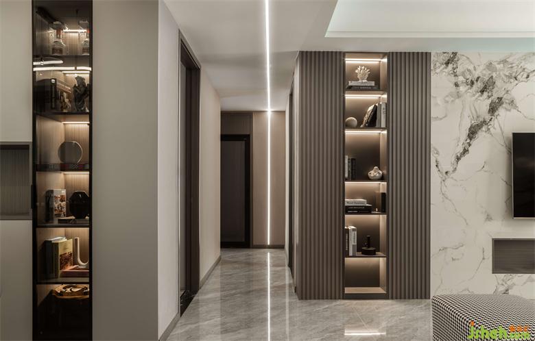 客廳是家人團(tuán)聚,招待親友的區(qū)域。用溫暖的木紋搭配高冷奢華的巖板,營(yíng)造出時(shí)尚的基調(diào)。私宅設(shè)計(jì)大地色系的墻布對(duì)墻面的包裹,顯得溫馨。
