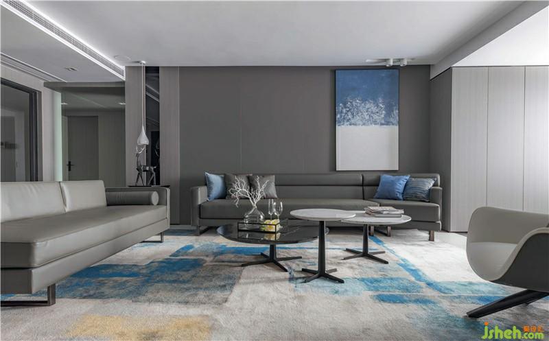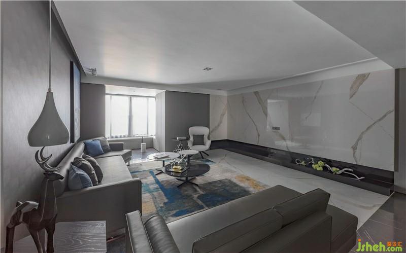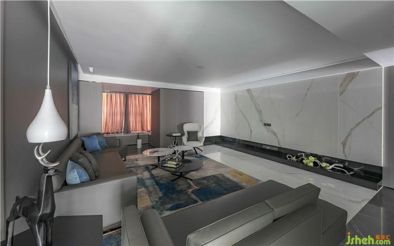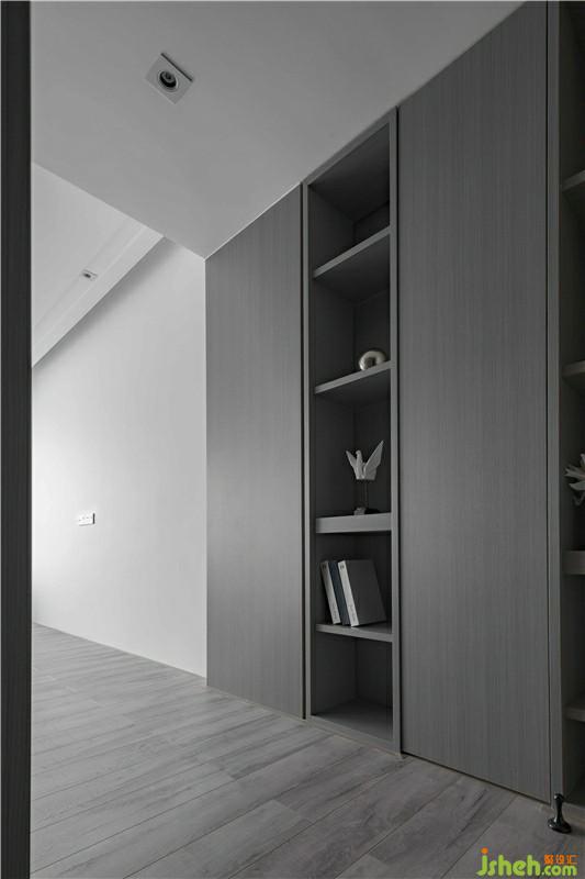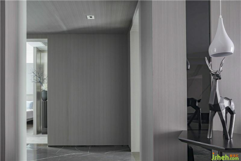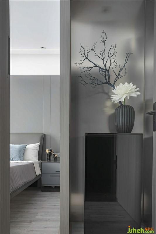次臥,設(shè)計(jì)師采用深灰色硬包作為背景墻并融入灰色木質(zhì),整體色調(diào)統(tǒng)一柔和。透明的櫥門,左右不對(duì)稱的吊燈,使空間層次感提升,帶來臥室藝術(shù)氣息,也更好的反映了熱愛藝術(shù)的生活態(tài)度。