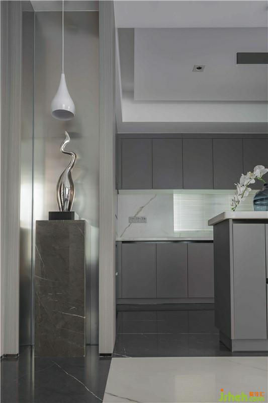 餐廳是黑色寬闊的落地窗帶來了寬闊的視野,在此用餐又是一種別致的享受,早餐、陽光,美好的一天從此開始。高級(jí)灰的地磚與大塊大理石瓷磚搭配,冷中帶暖,利落大方,在窗戶的明亮采光環(huán)境下,讓空間變得更加通透;開放式廚房打破傳統(tǒng)固有格局,讓空間的利用率最大化。