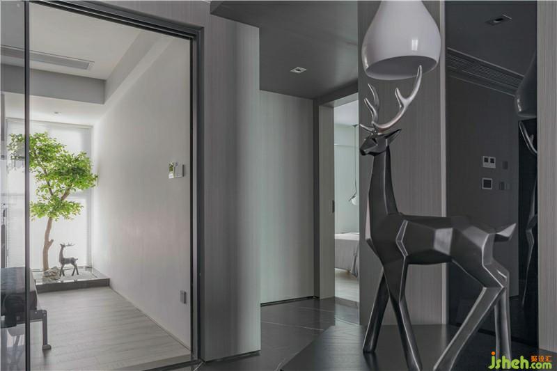 主衛(wèi)以灰色石材紋理的瓷磚打造,搭配白色衛(wèi)浴,一面鏡子,干凈利落,使得空間充滿現(xiàn)代感。盆景擺設(shè)也讓空間增添優(yōu)雅溫馨的氣氛。采用干濕分離設(shè)計(jì),黑色的磨砂門分割出干濕兩區(qū),讓有限的空間發(fā)揮無限的功能。