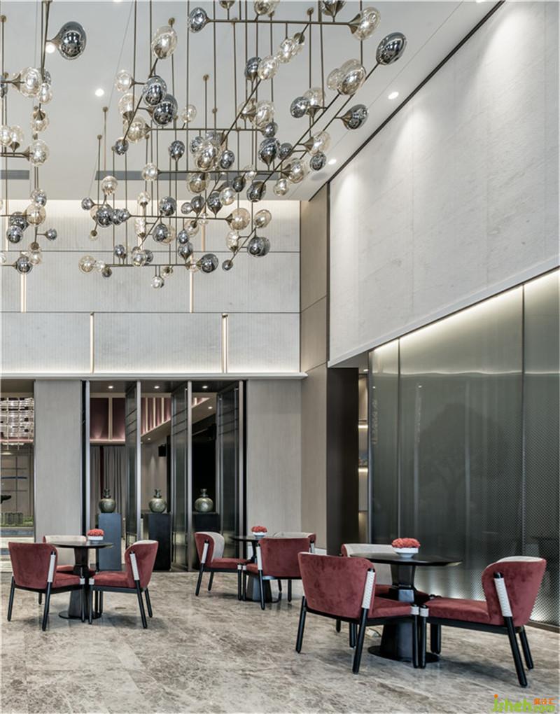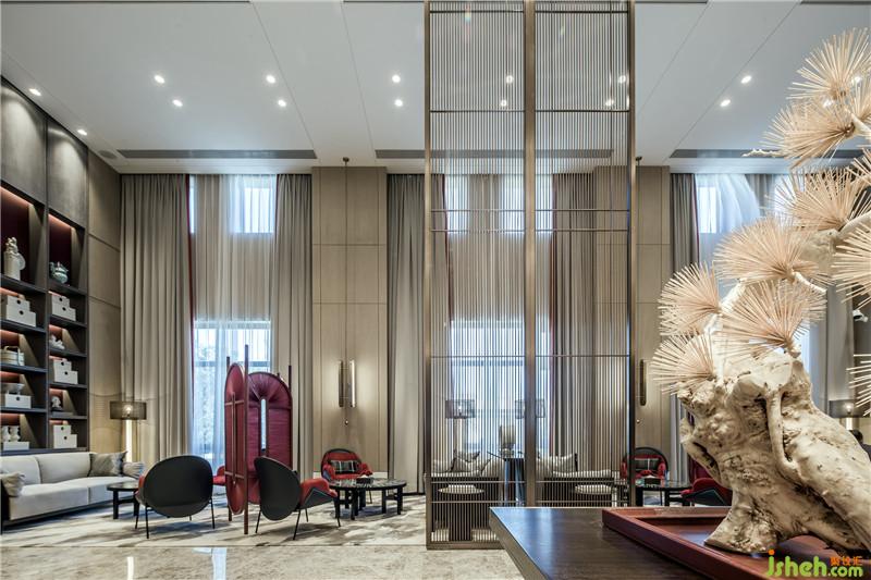 云深秋山落西風,縫是霧色半朦朧,空間整體,自然的質(zhì)感與藝術的精奢氣質(zhì)融為一體,奠定了整個空間的基調(diào)。棕色如水般流瀉,天花縱向線條向上延展,像山脈的紋理鋪展開來,木柵排布出空間的疏密節(jié)奏,大氣儼然中,亦不失自然樸質(zhì)的美學風韻。