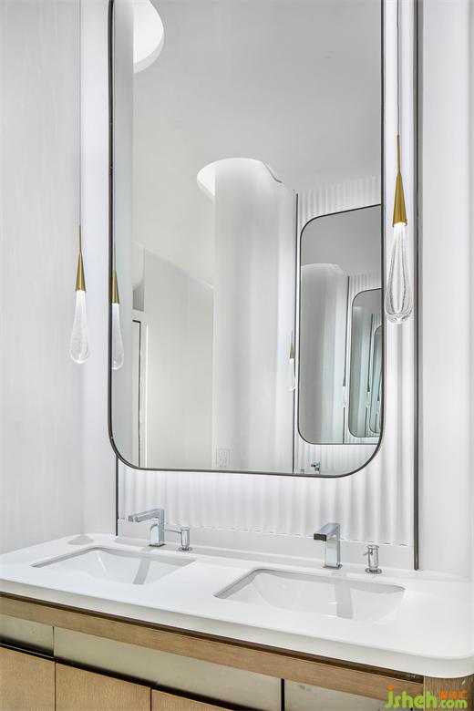 · 內(nèi)側(cè)部分,針對卷簾裝置與過道頂面的高差,設(shè)計師擯棄簡單的直線處理,采用柔和的弧線造型吊頂來呼應(yīng)空間設(shè)計語言,并設(shè)置反光LED燈槽來凸顯樓板部分的層高。