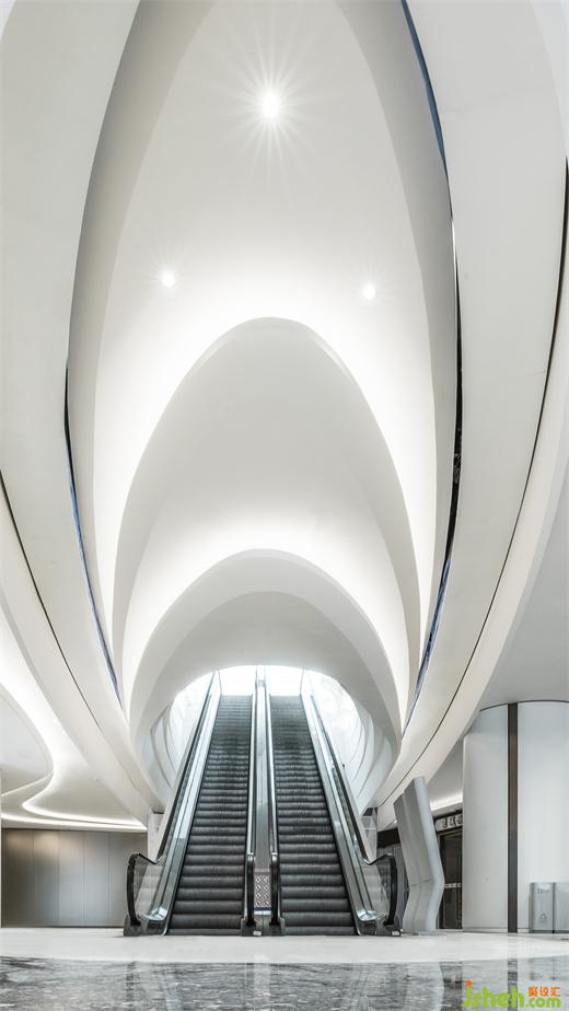 負一樓手扶電梯的天花吊頂,設(shè)計師模擬出層層暈開的波紋,呼應(yīng)一樓的風帆造型設(shè)計;