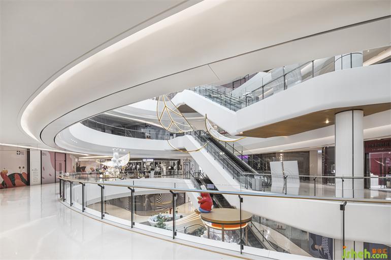 在商場內(nèi),設(shè)計師對水波紋之形進行抽象提純,形成江河文化意境昭示形象,大量采用曲線與弧面,打造靈動流體立面,尋求建筑的柔軟視覺觀感,結(jié)合設(shè)計對藝術(shù)的轉(zhuǎn)譯與思考,演繹出夢幻般的空間情境。
