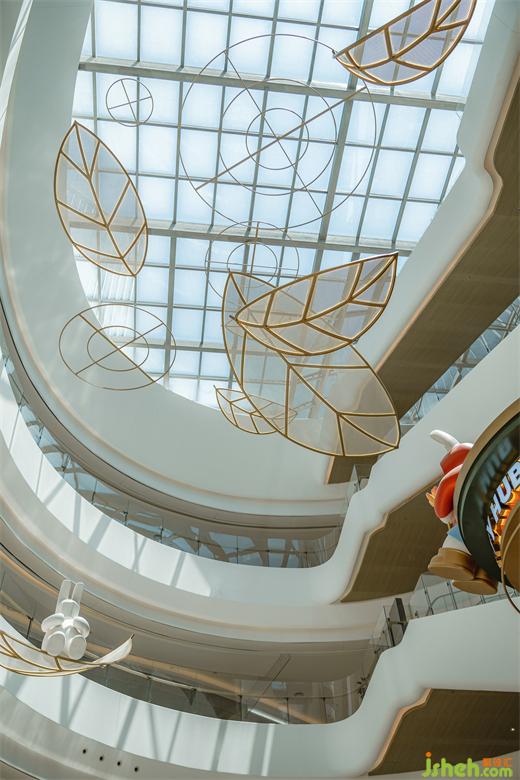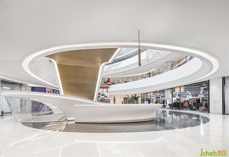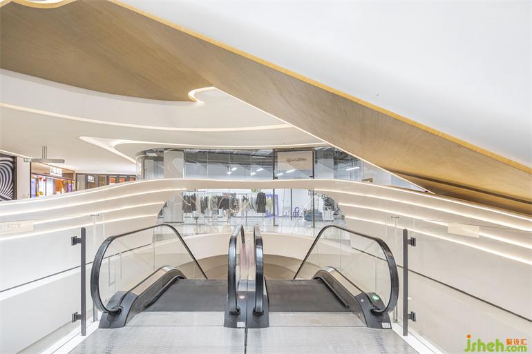 購物廣場設(shè)計為了延續(xù)整體空間設(shè)計語言,設(shè)計師對一樓中庭吧臺與手扶電梯拱門進行了一體化設(shè)計,從側(cè)面看來,仿佛乘風破浪的風帆;