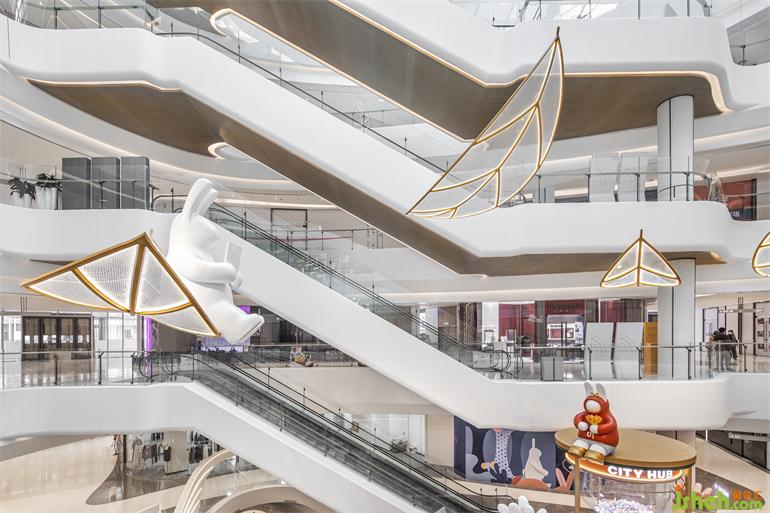 為了避免通過(guò)時(shí)碰頭,而且滿(mǎn)足在下方做立體造型的需求,購(gòu)物廣場(chǎng)設(shè)計(jì)師對(duì)電梯進(jìn)行了“輕量化”設(shè)計(jì),用鋁板裝飾底面拉伸空間,將扶梯側(cè)面材質(zhì)改為石材,盡可能釋放了扶梯下方空間。