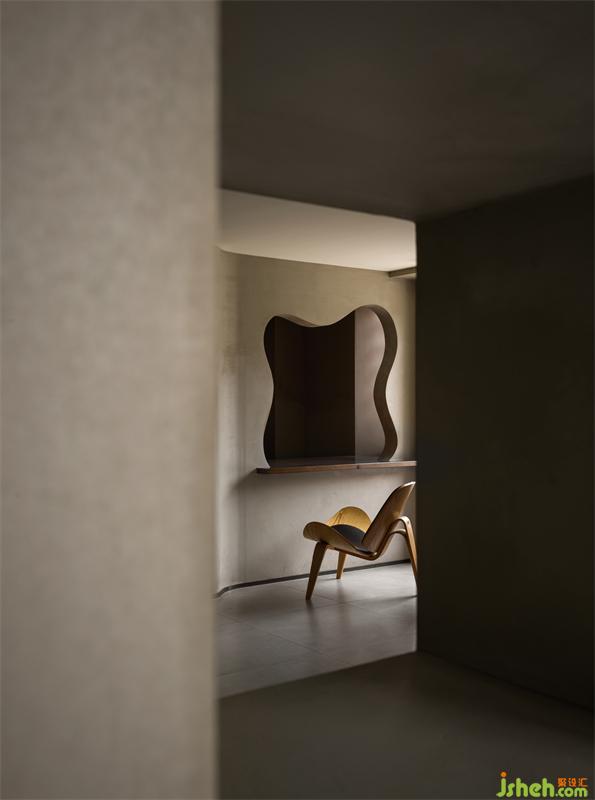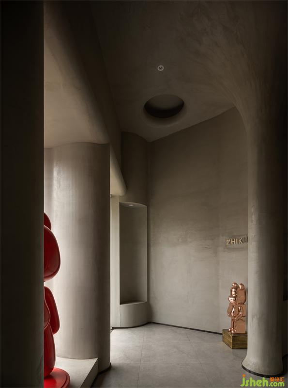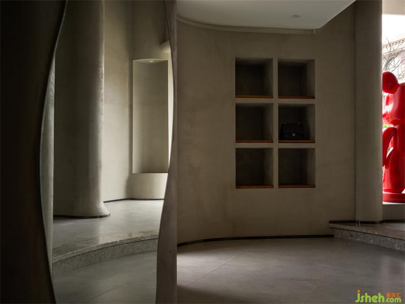 隔離了市儈的招搖,驛動的心被帶入室內(nèi)。店鋪設(shè)計建筑梁結(jié)構(gòu)與不同樓板之間的關(guān)系,與幾何構(gòu)造相互滲透,讓復(fù)雜性聚合成一個整體。避免了機械的乖張,故意營造出讓人詫異的破壞性影劇場景,特意手工打造的好幾種斑駁藝術(shù)圖案的漆面,在四季白晝的光線中漸隱漸顯,與厚重的幾何體塊幻化交織,迭代出飄渺的神秘效應(yīng)。