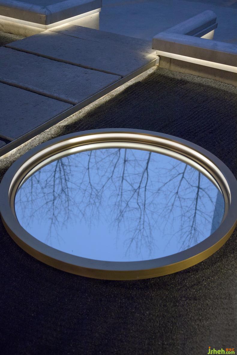 石板路左右兩邊的景觀,由黑色石子和四面圓鏡組合而成 ,鏡子映射天空,室內(nèi)設(shè)計(jì)師石子附于地球表面,路過(guò)時(shí)若向下俯瞰地面,天空和地面被壓縮于同一個(gè)平面,而俯瞰者的身體在這一刻,被置于天地之外.
