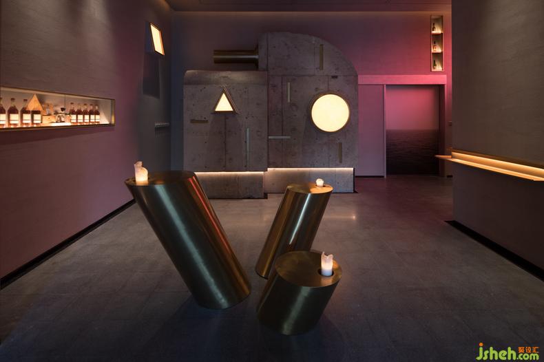 弧面頂上6顆吸頂燈,如星月般指引方向,左右兩側(cè)的墻角是兩條光之河流,而盡頭是一片大海.這片大海,便是一面電動(dòng)移門(mén),阻隔著酒吧主體部分和玄關(guān)的空間.這種阻隔像是生命里的一塊余地,調(diào)整節(jié)奏,可進(jìn)可退.