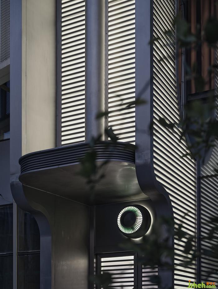凹凸有致的外立面及入口造型別具一格,燈光與水平條紋線條的穿插結(jié)合,既回應(yīng)了所在建筑的鋼網(wǎng)格圍合結(jié)構(gòu),巨型雕塑般的藝術(shù)形態(tài)又仿若開啟時(shí)光的“切口”。輔以鏡面對(duì)稱相組的視覺效果,在夜幕漫下時(shí)迷幻感也悄然而現(xiàn)。