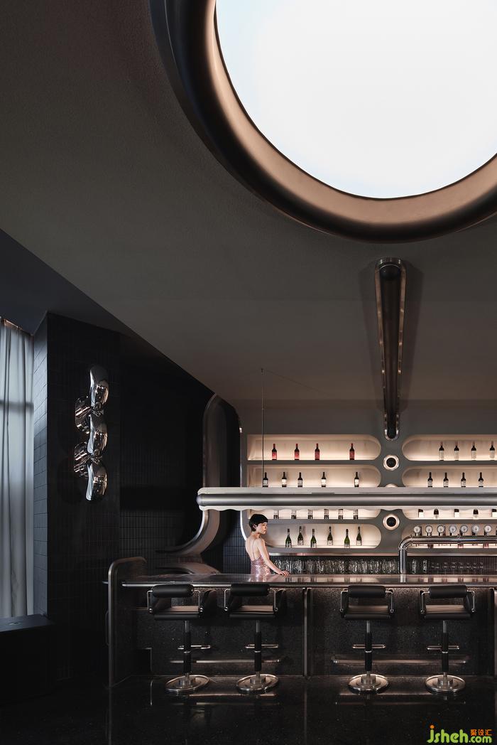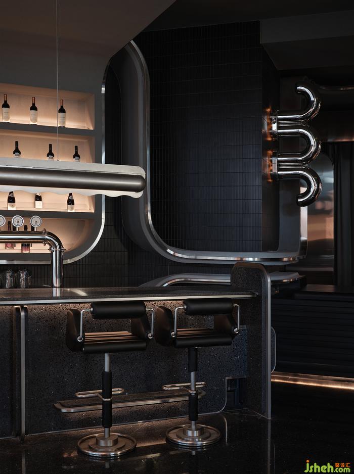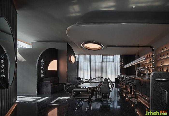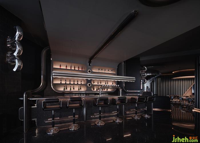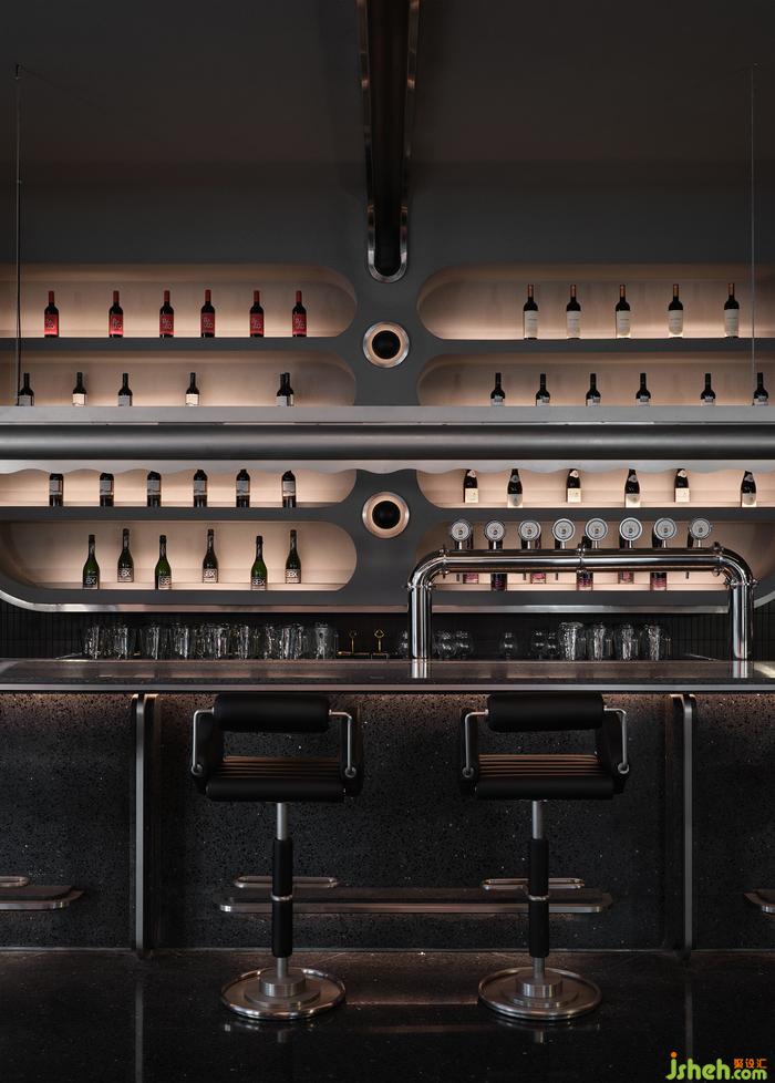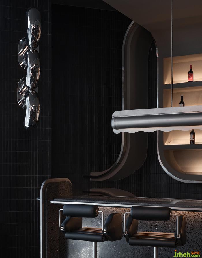 空間中的石材、金屬、皮質(zhì)、海綿、音樂、幕布,經(jīng)由設(shè)計在不改變物質(zhì)形態(tài)的基礎(chǔ)上,餐廳設(shè)計重新組合其線、面、體積、重量、紋理,而形成被鉆石般精密計算、切割打磨、晶瑩無暇的一個整體場景。幾何與有機(jī)構(gòu)圖交相疊映,不同光澤度中和色系上的沉悶,恰到好處地劃落視覺重點。