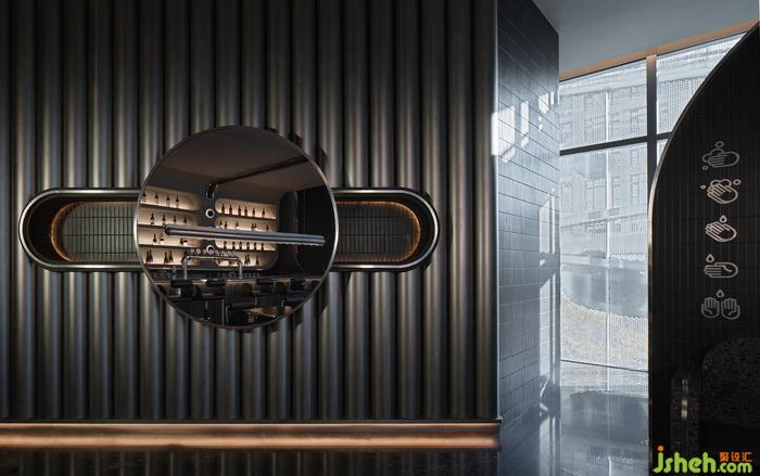 從舞臺(tái)吧延續(xù)至酒吧空間,天花和墻體界面嵌入隱潤(rùn)的光源,大面積的漫反射蘊(yùn)生微妙氛圍,餐廳設(shè)計(jì)鏈接或向外凝望或向內(nèi)探索的視線互動(dòng)和社交維度。色階過渡的光帶連通天花與酒架,而懸垂的粗糲原石裝置自帶物質(zhì)性的美學(xué)意義,微縮凝結(jié)為“點(diǎn)石成金”的敘事藝術(shù)。