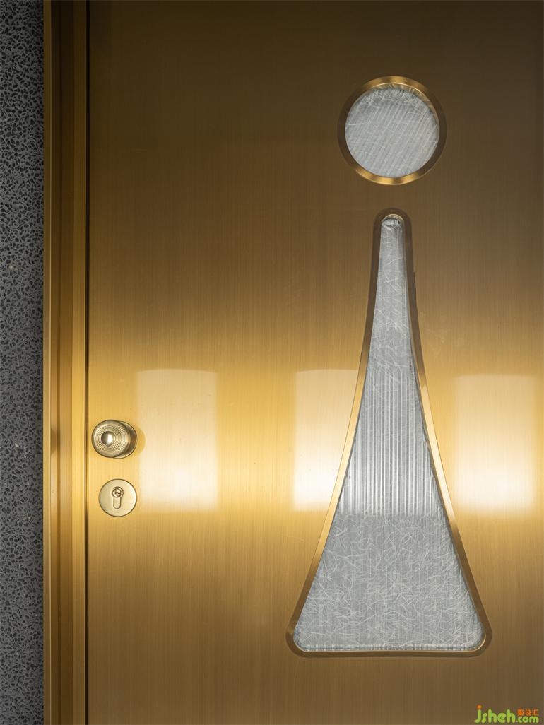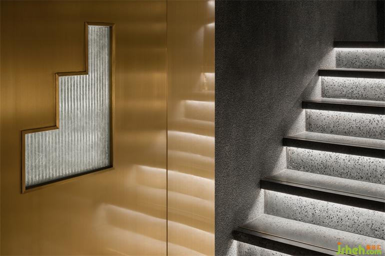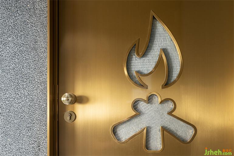 階梯式的通道指引動(dòng)線深?酷炫與克制交織的隨性舞臺(tái),表?冰冷的材料經(jīng)倒?處理?有著溫暖觸感,?洗?飾?的顆粒密度也隨時(shí)間?倍添肌理感。?與銅疊加的三個(gè)圓柱體裝置模擬放??例的“燭臺(tái)”,裝修設(shè)計(jì)映照出環(huán)繞四周的六個(gè)功能性配套空間,符號(hào)化的視覺標(biāo)識(shí)似開啟每扇?的魔法鑰匙,稻草和宣紙混搭勾勒出?茸茸的圖形底紋。