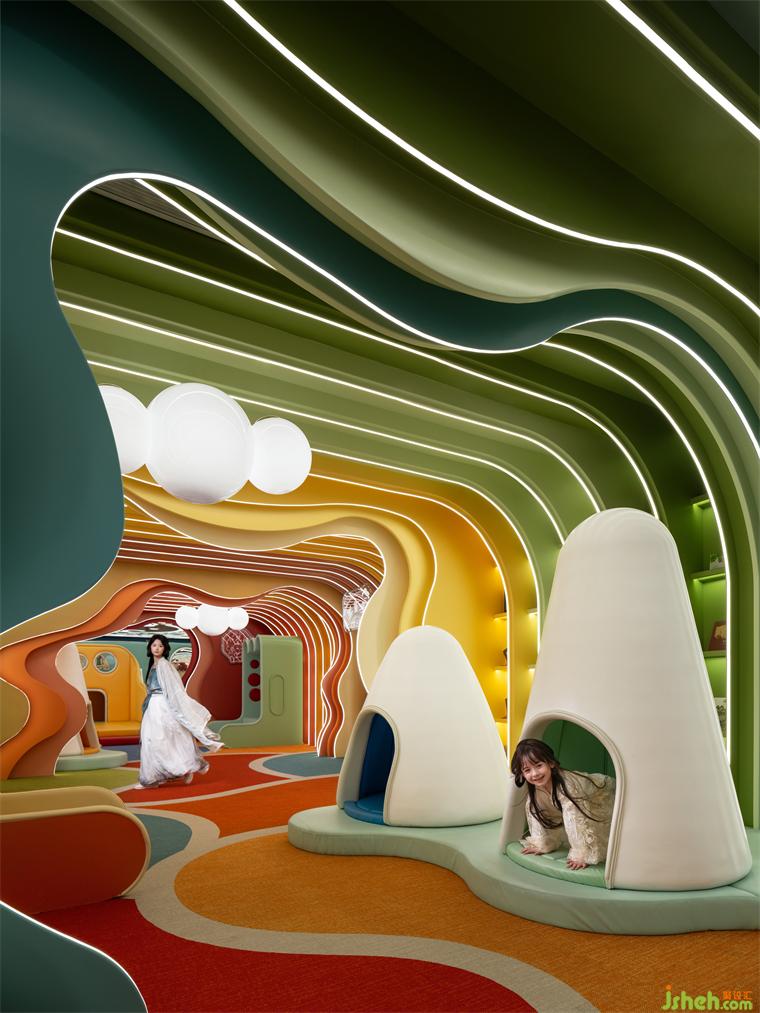 暗喻精神與文化傳遞的圖書區(qū),以本真意識的山水夢境觸動(dòng)感知的飽滿張力,在七彩光譜遞進(jìn)渲染的層疊序幕中,書籍作為人類文明的記錄載體,釋放新舊記憶的交匯信息。