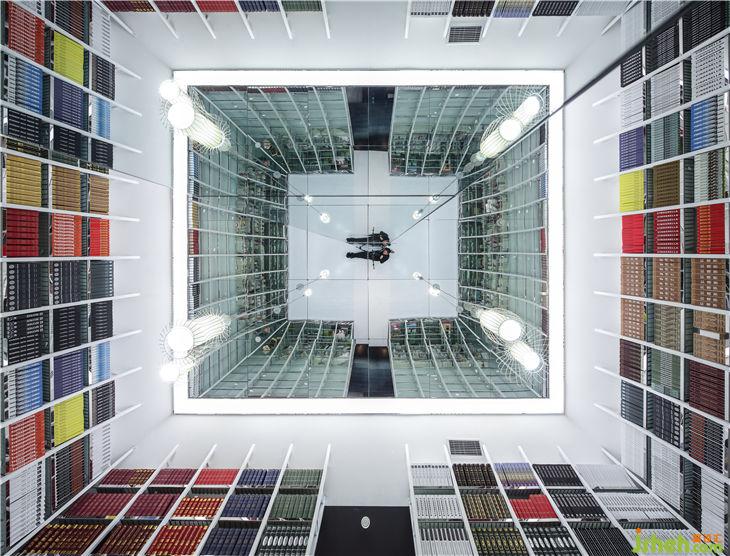 二層的中心是純潔的白色,書籍的圣殿,在鏡面天花里,弧線上升的書架在虛像的另一面和實(shí)像閉合成一個(gè)完全意義的圣殿,更是蒼穹,這你無法用言語去精確描述。終于,當(dāng)你通過書本堆積的樓梯爬上來進(jìn)入圣殿,你或許會(huì)長(zhǎng)長(zhǎng)吐口氣,坐在地上,有點(diǎn)訝異,但更多是喜悅,觸手就是仿佛漂浮在空中的書籍,但這里閱讀的已不僅僅是文字的追逐,而是某種心靈的感應(yīng)。當(dāng)你浸潤在知識(shí)的大海之中,就會(huì)發(fā)現(xiàn)閱讀是我們不可或缺的生活本能。而你更明白了書籍是一種媒介,在圣殿,讓你和久已遺忘的靈魂有了重新認(rèn)知的機(jī)會(huì),你看到了天堂。