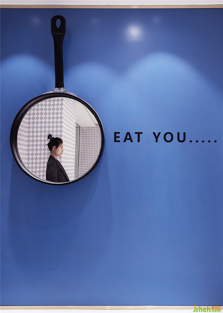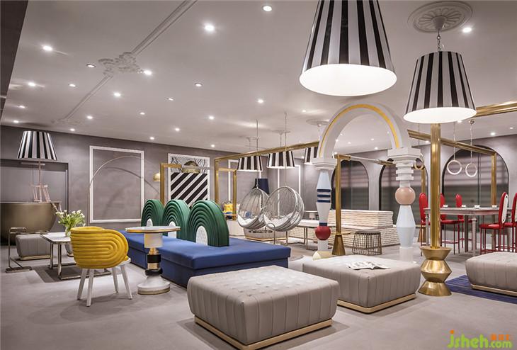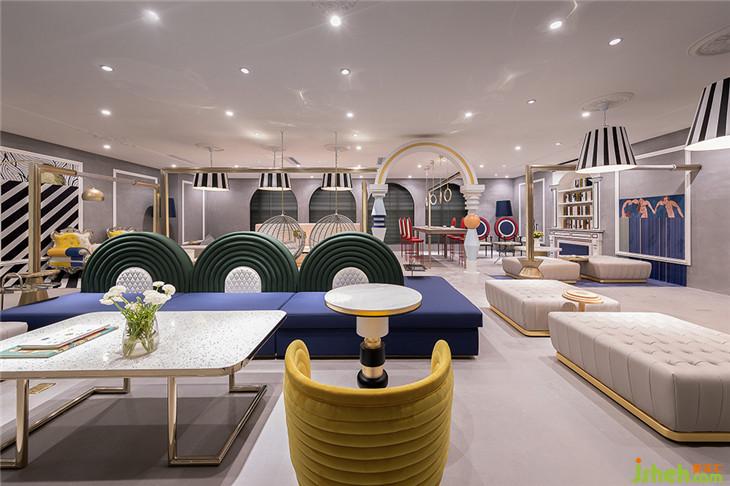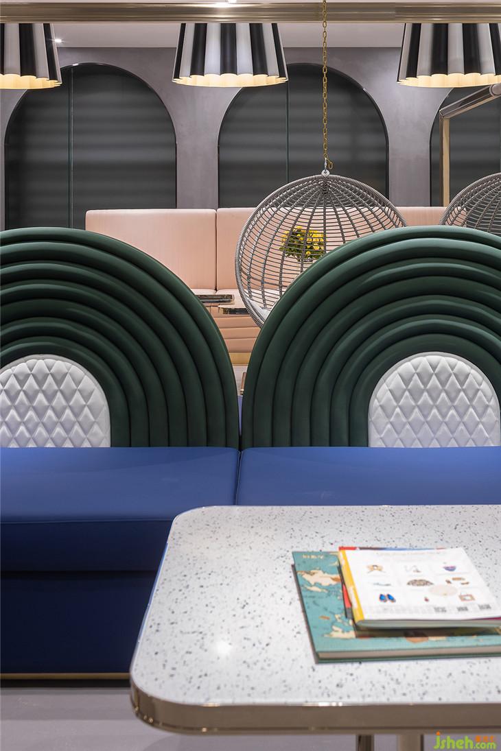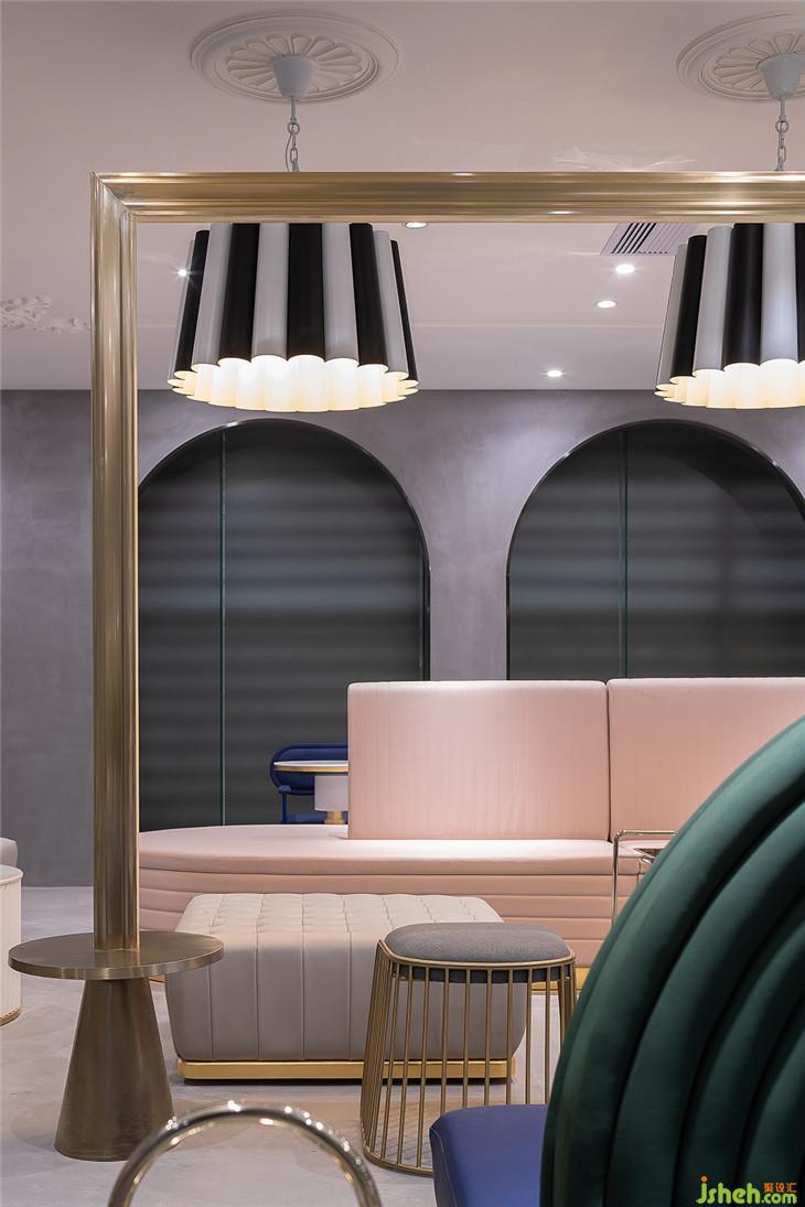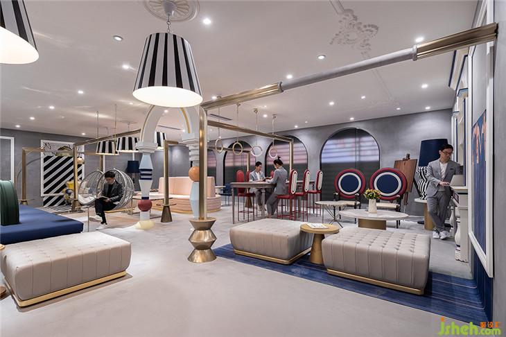 經(jīng)過扶梯上到三層辦公空間,在三層整體的布局上,我們分別在兩個(gè)扶梯上來的空間作為公共客廳區(qū)域,并且把兩個(gè)公共客廳用共享會議區(qū)、休息區(qū)串聯(lián)起來,把需要比較私密安靜的辦公空間放在客廳之外。動(dòng)靜分離的布置,一方面讓視覺點(diǎn)更集中,一方面也便于后期的運(yùn)營管理。從主大堂扶梯上來,首先看到的是work hard 的歡迎櫥窗,然后轉(zhuǎn)身會看到一個(gè)特別怪誕、藝術(shù)的公共客廳。這里我們引用了健身器械的元素進(jìn)來,想要傳達(dá)健康工作的理念。我們把單杠吊環(huán)意化成巨大的香檳金畫框,當(dāng)你穿梭其中就像置身于一幅幅畫作當(dāng)中,我們根據(jù)使用的行為模式,設(shè)計(jì)了多種座椅形式,寬敞的大沙發(fā),一個(gè)人安靜獨(dú)享的座椅,休閑的吊椅,學(xué)習(xí)的吧椅長桌。當(dāng)你在這里休憩工作時(shí),也可以在旁邊的單杠吊環(huán)拉伸一下。為了打造客廳的舒適感,我們設(shè)計(jì)了一些地毯,并且讓它和墻面的畫作結(jié)合在一起,讓它不僅是裝飾還是空間不可或缺的一部分。在客廳的邊上是一條開放式的水吧空間,還有一個(gè)休閑玩樂的海洋球池。透過水吧區(qū)可以看到兩幅怪誕的畫作,梵高自畫像的頭部和蒙娜麗莎的手分別代表男女衛(wèi)生間的標(biāo)志。穿過客廳到達(dá)共享會議室和電話亭休息間,會議室我們采用簡練的硬裝,不進(jìn)行過多裝飾,把投影機(jī)的盒子作為一個(gè)視覺亮點(diǎn)突顯出來。電話亭休息區(qū)我們采用比較溫暖的色調(diào),考慮使用的舒適性,采用軟包的坐墊和靠墊。