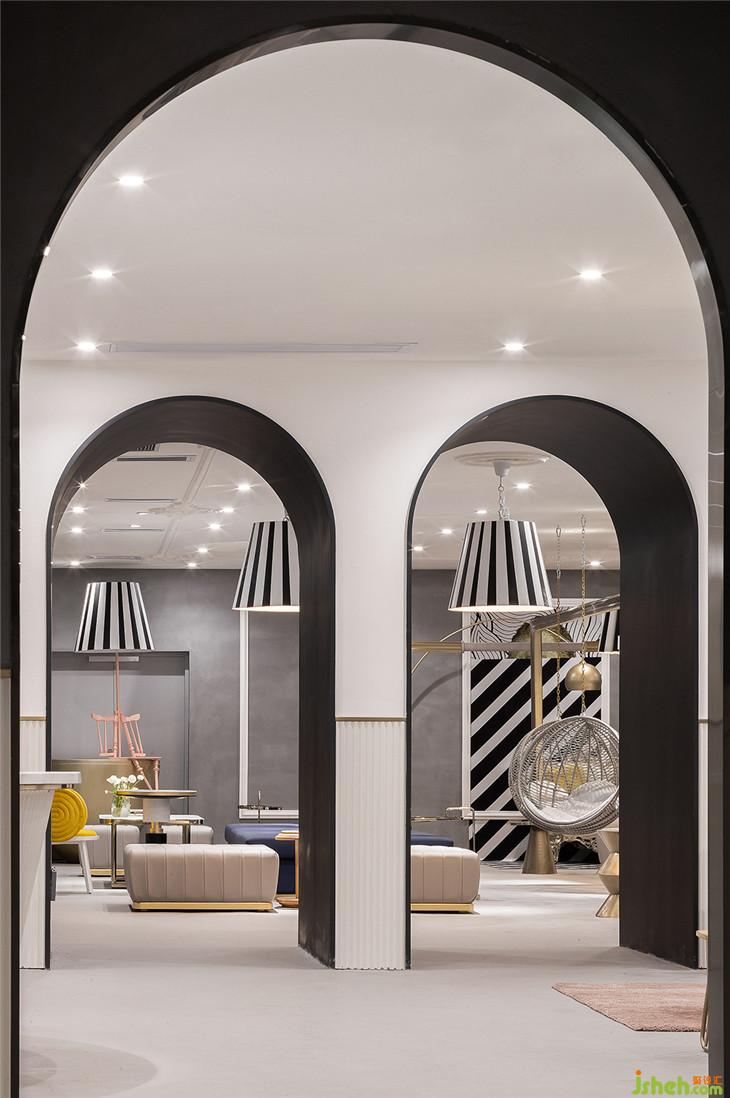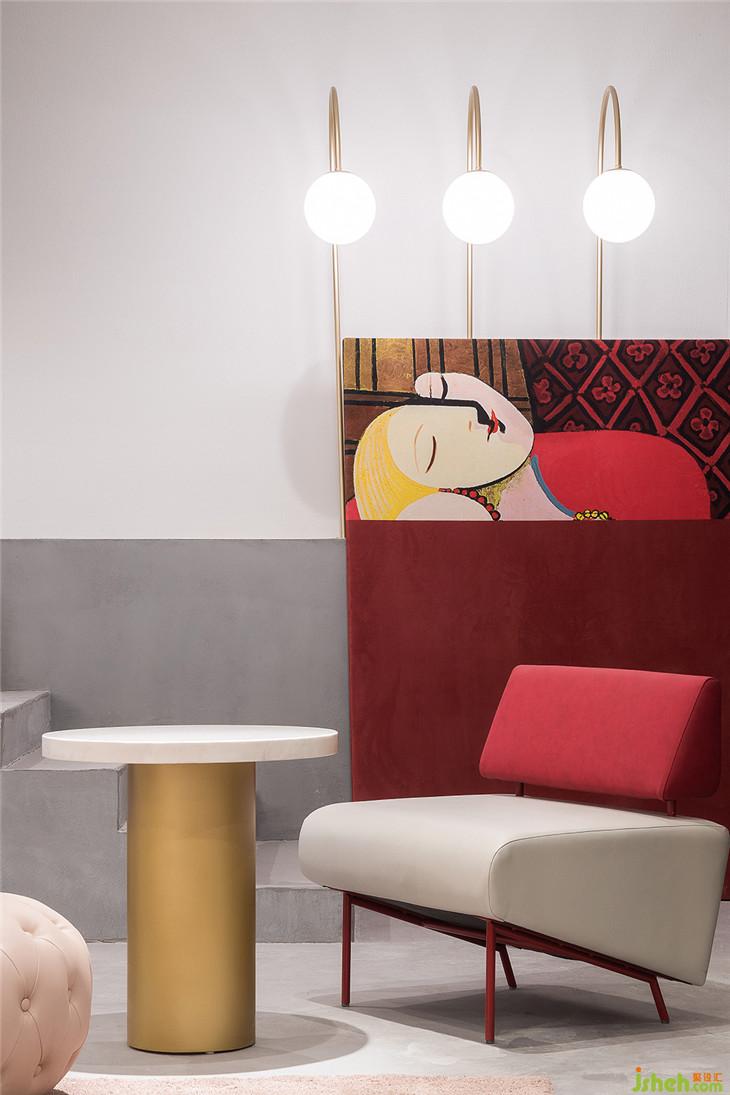四層作為大型辦公空間,整體的布局上,同三層一樣,分別在兩個(gè)扶梯上來(lái)的空間作為公共客廳區(qū)域,大型的辦公室環(huán)繞在客廳周圍,讓每一間公司都能快速的到達(dá)??蛷d區(qū)域依然采用多種的座位形式滿足不同的需求,公共的水吧空間也融合在這里,同時(shí)設(shè)置相應(yīng)的私密休息空間。因?yàn)獒槍?duì)的客群的不同,在調(diào)性上偏成熟穩(wěn)重,在空間里運(yùn)用比較多的木飾面和灰粽色的混凝土飾面。家具也不同于三樓的怪誕色彩,更偏簡(jiǎn)練沉穩(wěn)。這里我們也引用了健身器械的概念,很多卡座和坐凳都引用了按摩椅、瑜伽球的概念,提醒人們?cè)诠ぷ髦嘁材荜P(guān)注一下自己的身體。