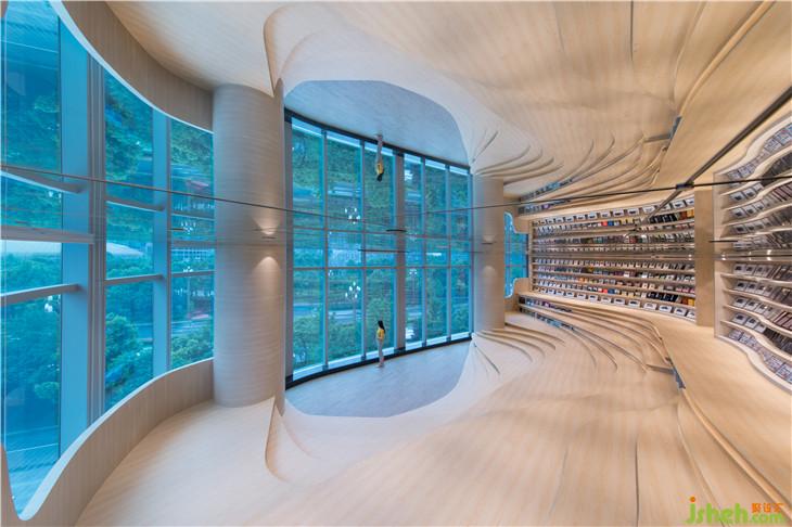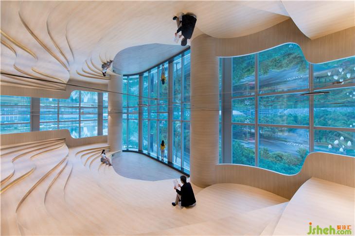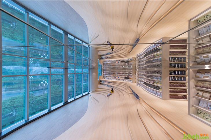 “竹林”左側(cè),隱約可見的紅色磚墻,便是此間鐘書閣最具特色的地方。通高5米的空間,紅色磚墻一砌到頂,圍合成一個個獨立的小城區(qū),空中一條步行棧道穿插著其中,時而繞墻而行,時而穿門而去。只為偶遇某一本心儀的書籍,盡情的徜徉在小小的城區(qū)中。全落地窗旁散落著可供休息的座椅,在午后溫暖的陽光下,品上一杯茶,讀著心儀的書籍,此生愜意溢于言表。