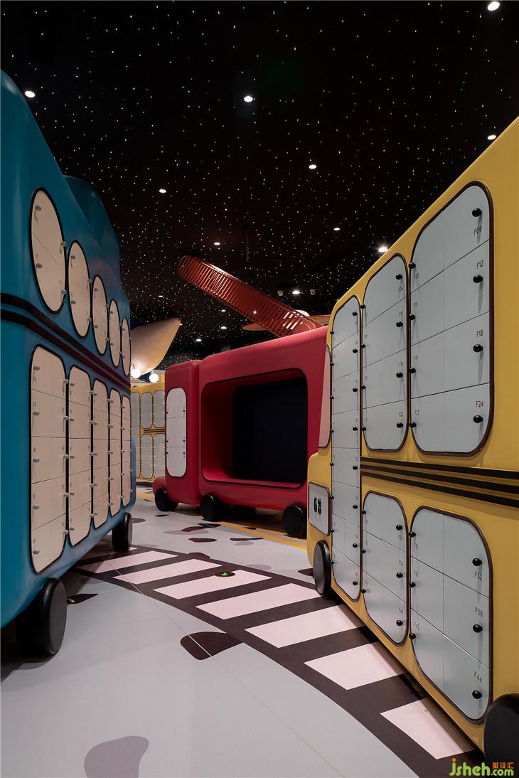 MELAND城市作為整個項目的交通樞紐區(qū),是人群的分流處,亦是動線的交匯點(diǎn)。進(jìn)入城市,模擬布達(dá)拉宮退階型設(shè)計的房屋,增加了整個空間的流線感。整個城市采用了濃郁而富有戲劇性的舞臺色彩,勾勒出格林童話般的神秘感和怪誕感。設(shè)計師引借游戲npc的概念,別出心裁地設(shè)計了一些卡通人偶裝置,卡在人群動線的各個節(jié)點(diǎn),它們既承載了指示標(biāo)牌、垃圾桶等功能,又為空間的故事情節(jié)補(bǔ)充了生動的角色。遍布在各個角落的時鐘元素,從天而降的巨大建筑塊,時間的流淌和發(fā)展的痕跡以具象化的設(shè)計手法表現(xiàn)了出來,意在提醒家長們珍惜與孩子相處的時光。