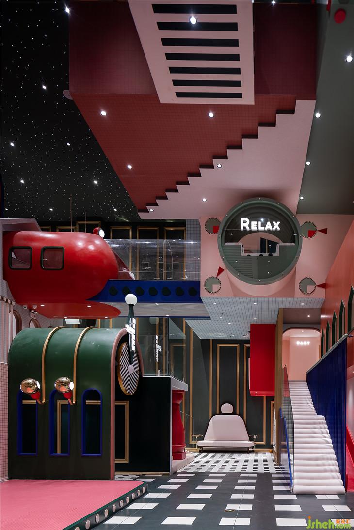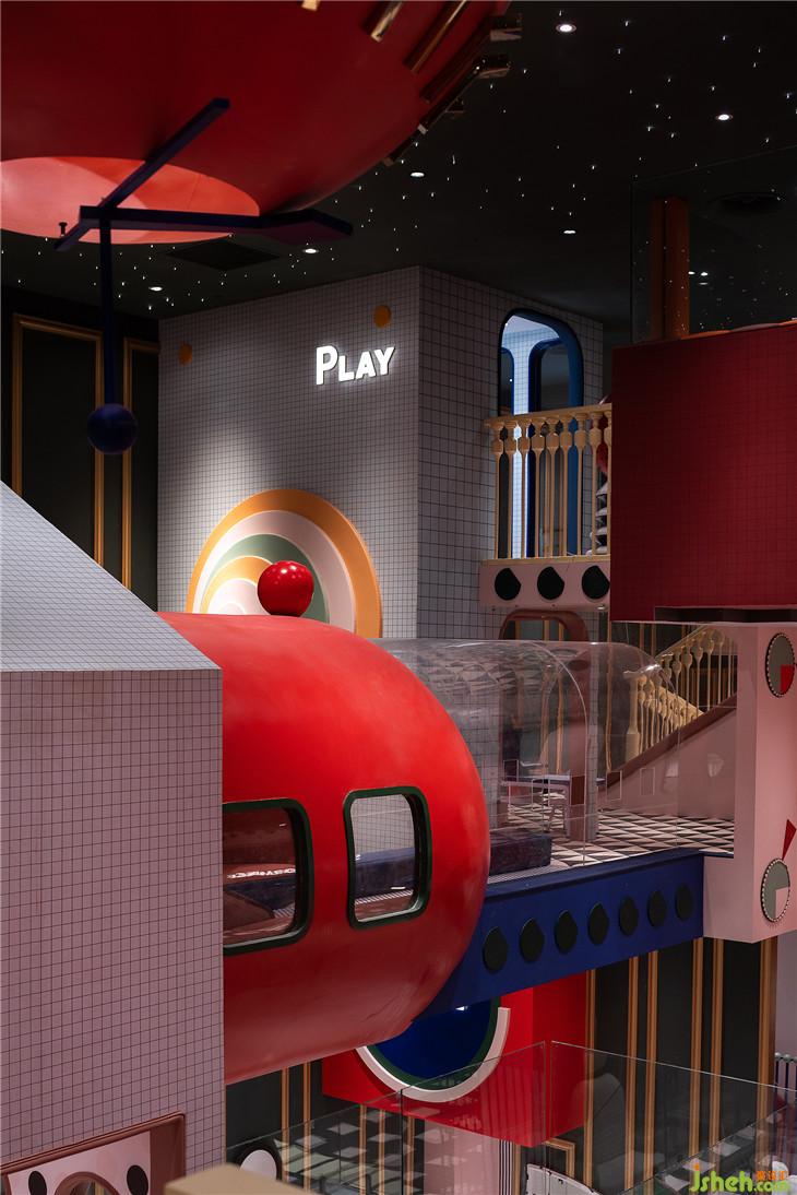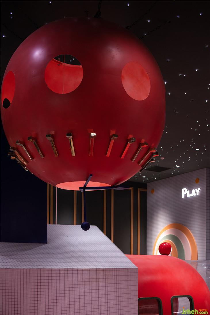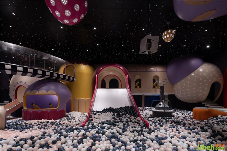 球池區(qū)位于平面空間上的西南角,像是MELAND城市邊緣一塊未經(jīng)開(kāi)發(fā)的密林。由青蛙和蝸牛藝化而成的大型裝置,包裹住娛樂(lè)設(shè)施的同時(shí)也串聯(lián)起了爬道和滑梯。奇幻紫調(diào)與夸張波點(diǎn)的活潑搭配,刺激著小朋友解放愛(ài)玩鬧的天性。與傳統(tǒng)的室內(nèi)攀爬不同,在MELAND的攀爬區(qū),白色的背景墻配以紅色的支點(diǎn),與延伸到地面的紅色波點(diǎn),共同堆砌出了這個(gè)空間時(shí)尚而怪誕的藝術(shù)質(zhì)感。
