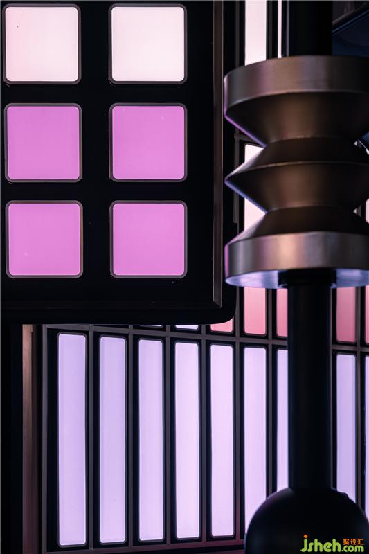攝影燈上不同幾何形態(tài)的暖色調(diào)燈光不僅帶給觀眾極強(qiáng)的暗示,更是設(shè)計(jì)師的巧妙構(gòu)思:燈光經(jīng)過反射作用后與地面漸變交錯(cuò),在延伸的網(wǎng)格立面中明暗過渡形成流暢動(dòng)線,整體的抽象藝術(shù)風(fēng)格凝練出了創(chuàng)意與活力交匯的精湛美感。電影院設(shè)計(jì)