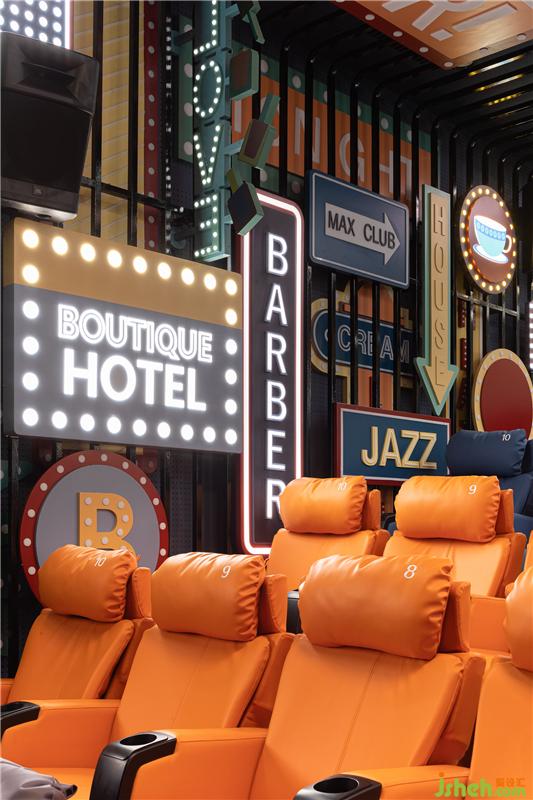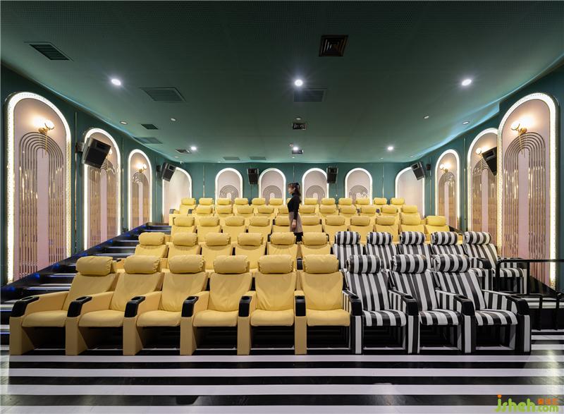不論主題影廳或是私人包廂,設(shè)計師并未忽視聲學環(huán)境的特定要求。場內(nèi)壁布和墻面吊頂均使用了吸音裝置,個性化地毯有效減少噪音。舒適座椅結(jié)合視線高值差與視點高度,保證高質(zhì)量的聽覺與視覺享受,提升觀眾的沉浸式觀影體驗。電影院設(shè)計