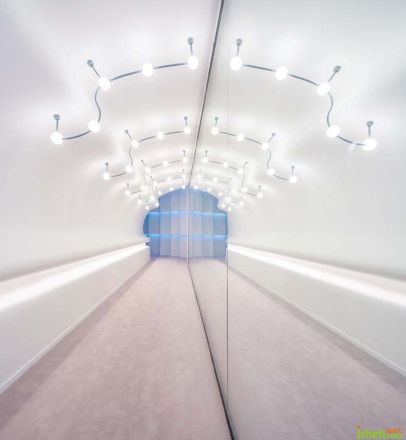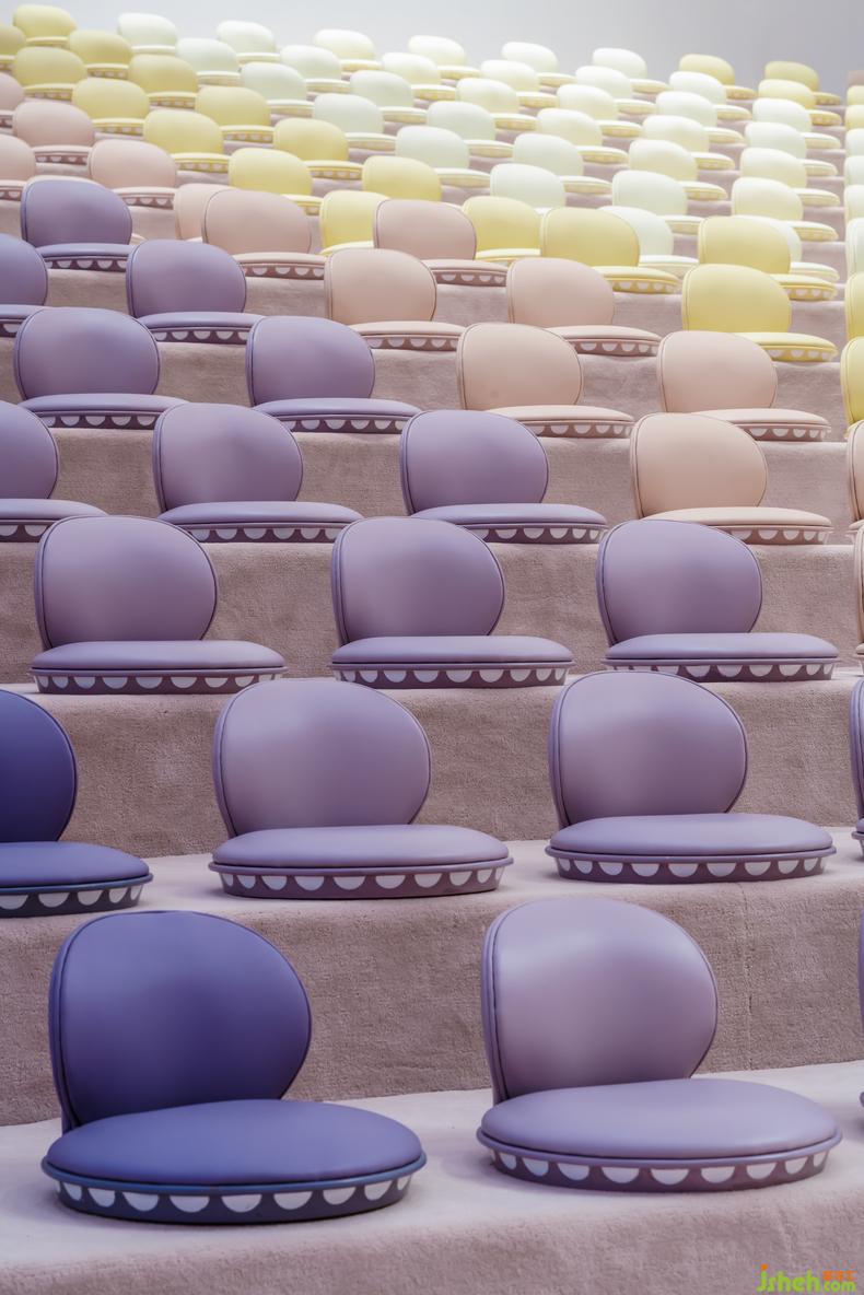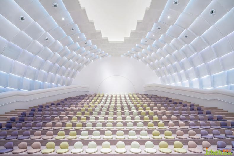 童話的質(zhì)感與色彩在禮堂內(nèi)愈加濃郁,球形的吊頂與白色的背景烘托了禮堂莊重圣潔的質(zhì)感,點亮場內(nèi)的背景燈,漸變色的座椅與燈光暈染出動人的霞光,讓整個空間顯得靈動柔美。孩子們仿佛在綻放的花蕊中,像一只只靈巧漂亮的小蝴蝶。