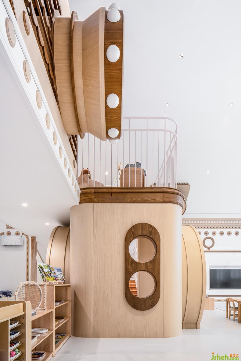 尖頂?shù)慕ㄖ庑螏砹颂厣拈w樓生活教室,幼兒園設(shè)計懷著“留下孩子們生命中的每一刻”的美好祝愿,引入了照相機(jī)這一設(shè)計元素。借用閣樓的挑高,設(shè)計師設(shè)計了可供上下攀爬的游樂區(qū),滿足小朋友玩鬧的天性,而相機(jī)的鏡頭成了孩子們的通道與爬道。墻面童趣化的裝飾呼應(yīng)了家具的淺柔的木色,也勾勒出了精致的貴族感,讓整體空間簡約而溫馨。