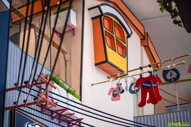 禮物盒主題區(qū)與公寓主題區(qū)摒棄了經(jīng)驗設計的手法。室內設計師放大版的禮物盒堆疊出了小城,被風暴吹得“東倒西歪”的房子打破次元,體現(xiàn)漫畫世界的童趣。在遵循空間邏輯與功能實現(xiàn)的前提下,設計師從日常生活場景出發(fā)為顧客制造了一場超現(xiàn)實的幻想式體驗。人行道彎彎折折地穿插在其間,室內設計師每個轉角都塞滿了奇趣巧思的興趣點設計,讓消費者的好奇心和探索欲被充分調動,延長人群在此逗留的時間
