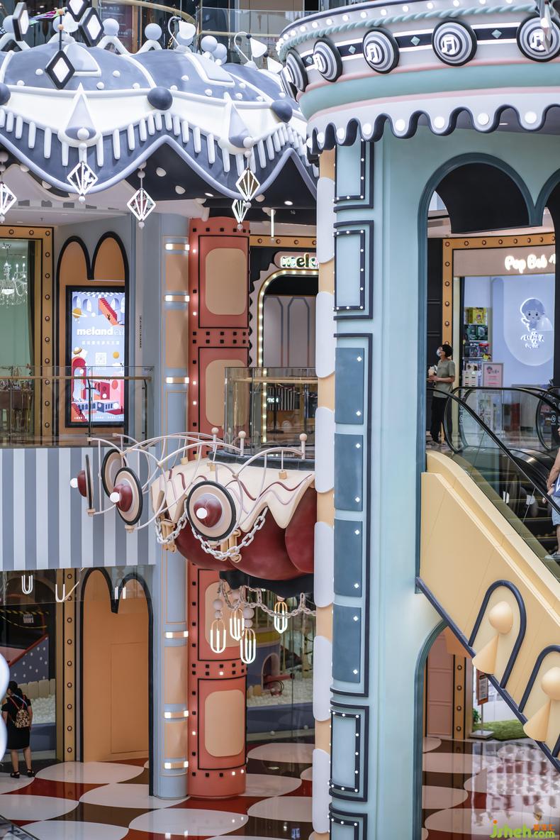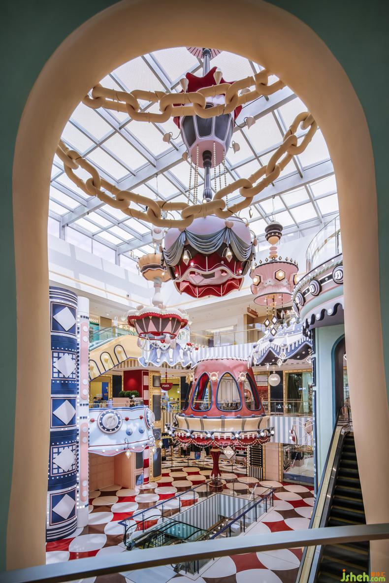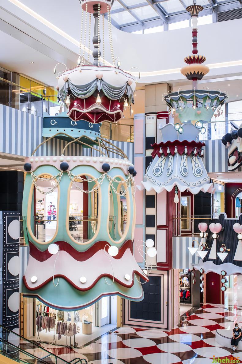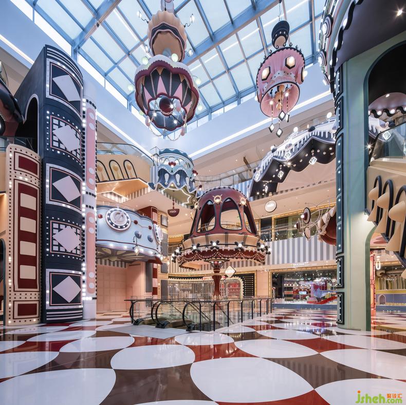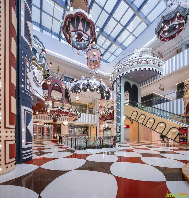 有別于多數(shù)商區(qū)規(guī)整單調(diào)的布局慣性,主題公區(qū)設(shè)計師一反常規(guī)的店鋪邊界,引入了前后突進(jìn)式的布局來塑造兒童空間趣味性。不僅在平層的橫向維度上優(yōu)化了店鋪的面積使用,使消費(fèi)者的購物動線變得富有探索樂趣,更從縱向維度出發(fā),豐富商場樓層之間上下關(guān)系的交互性,使得整個內(nèi)庭的空曠感大大減少,聚攏了消費(fèi)人氣。