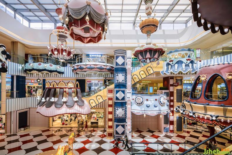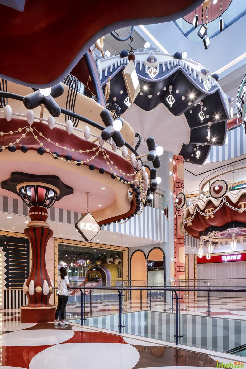設(shè)計師突破傳統(tǒng)裝飾美學(xué),賦予書本、臺燈、鳳尾夾、主題公區(qū)設(shè)計尺子等文具恢弘的建筑尺度,營造兒童區(qū)獨(dú)特的沉浸式體驗(yàn)效果。巨型構(gòu)造與日常用品的奇異尺度反差,不僅更好地統(tǒng)籌了公區(qū)內(nèi)攔河裝飾、燈具、店鋪立面、導(dǎo)向標(biāo)識等,且場景的交錯讓童話氛圍能夠迅速傳達(dá)到人群,準(zhǔn)確捕捉主力消費(fèi)者的注意力。