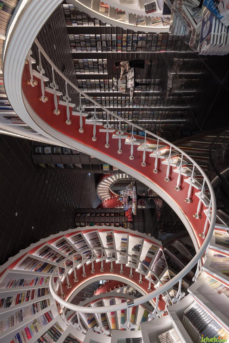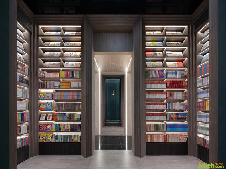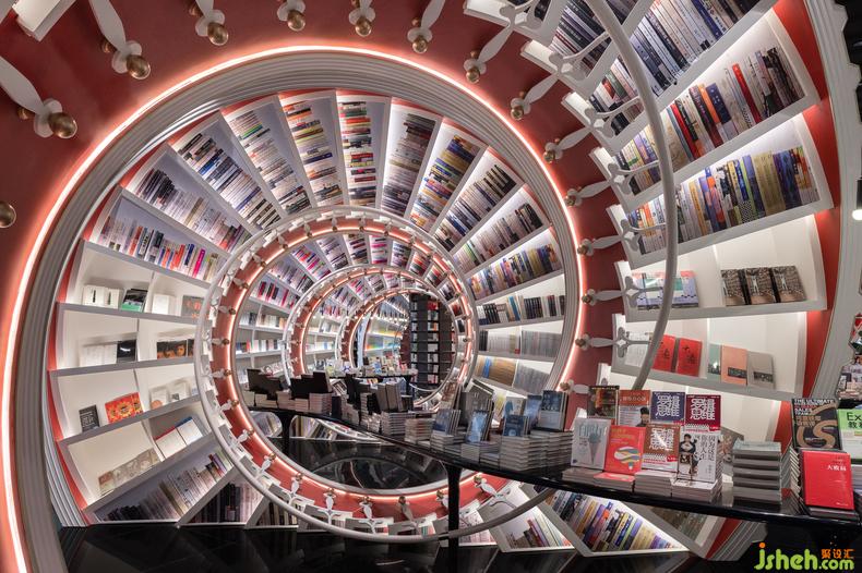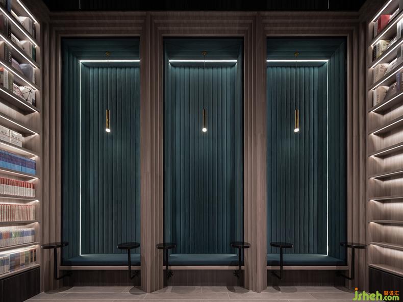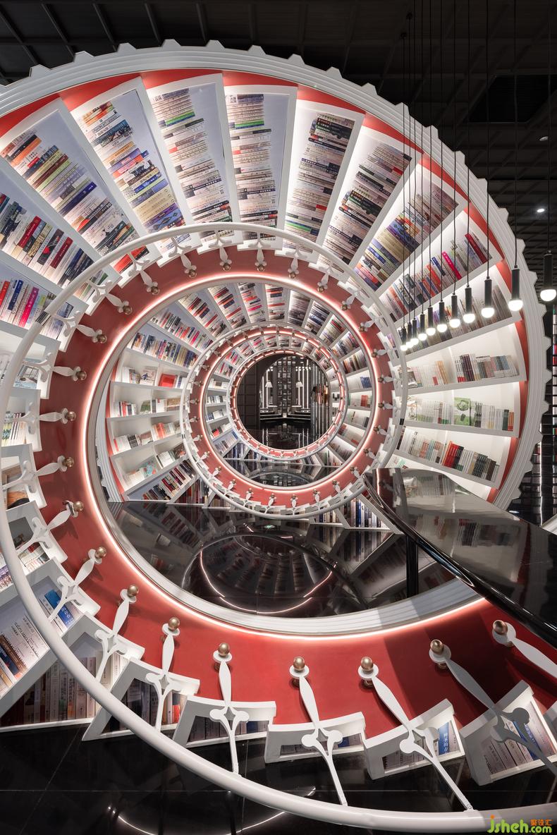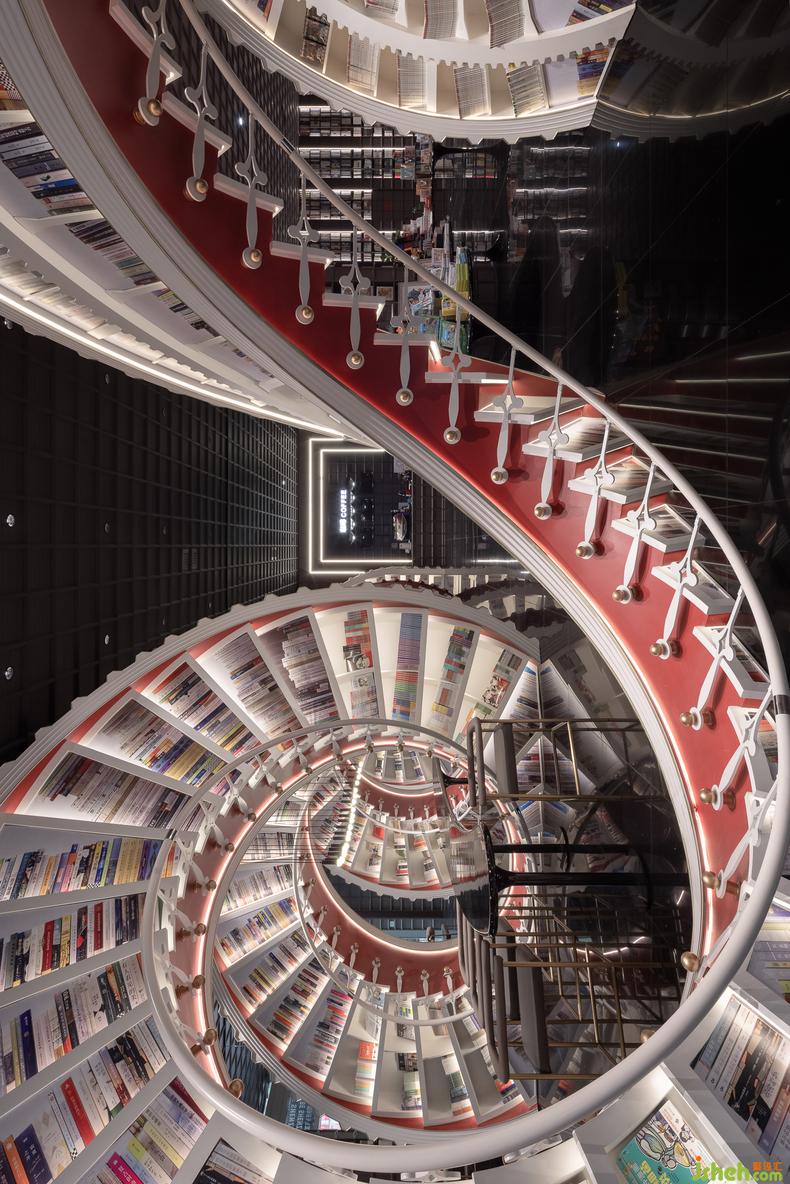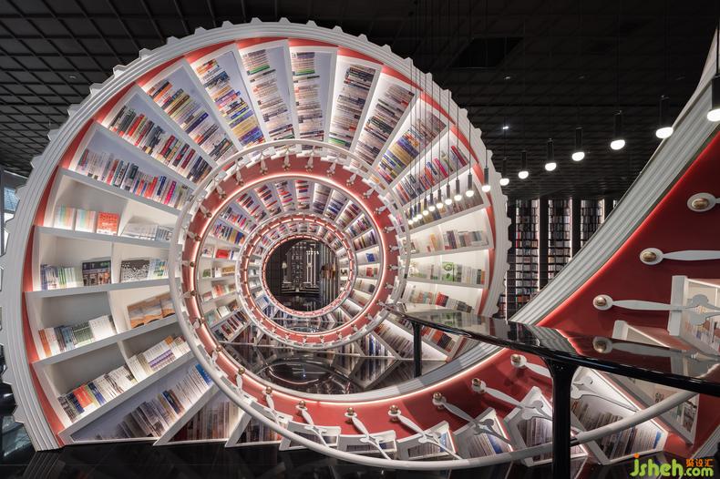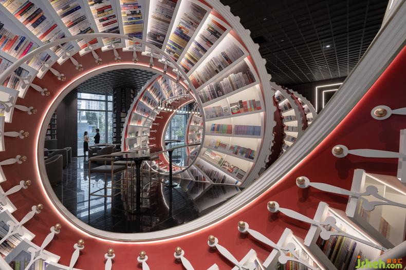 高爾基說過:“書籍是人類進(jìn)步的階梯。”拉斐爾也曾在名畫《雅典學(xué)院》書店設(shè)計(jì)中讓代表著哲學(xué)、數(shù)學(xué)、音樂、天文等不同學(xué)科領(lǐng)域的文化名人會(huì)聚于階梯前探討知識(shí)。設(shè)計(jì)師提取出智慧階梯的美好寓意,將論壇區(qū)典雅莊重的書架整合為綿延的階梯,砌筑出神圣的知識(shí)殿堂。