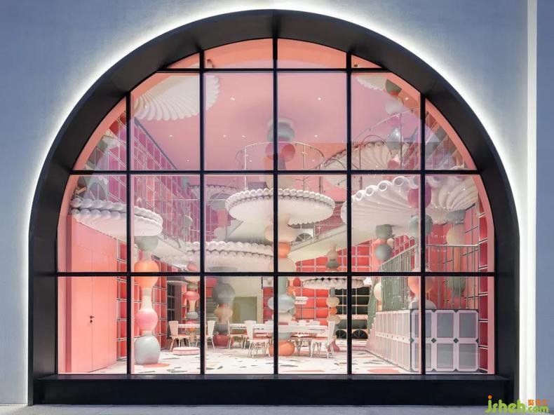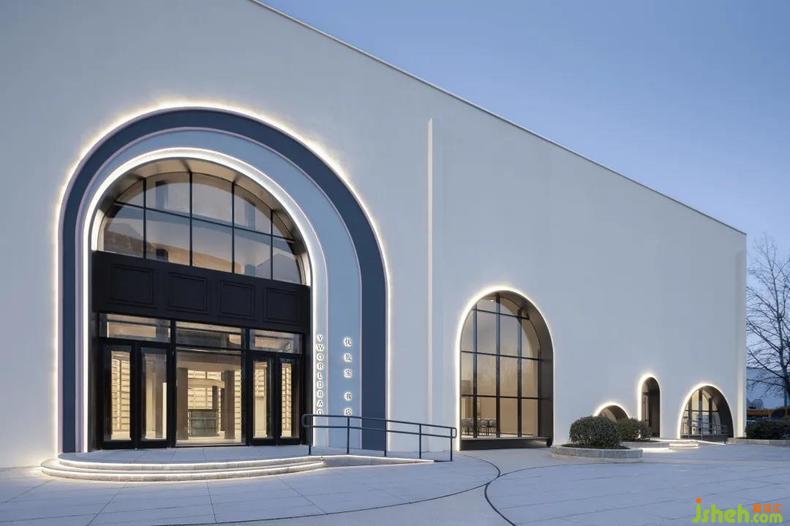 于方形的建筑盒體底部洞開一組大小各異的拱形門窗,曲線增添了些許柔和觀感。門窗中不同區(qū)域的風光如畫卷展開,吸引客群的目光,延伸空間內部的印象與意蘊。入口恢宏的尺度賦予了人震撼的身心體驗,純白極簡的建筑外殼中包裹的極致夢幻內核眼入眼簾。