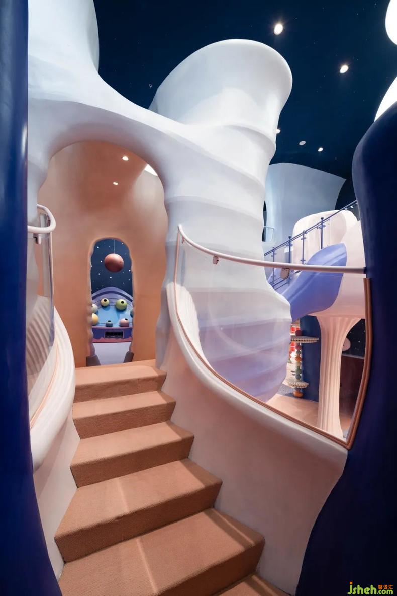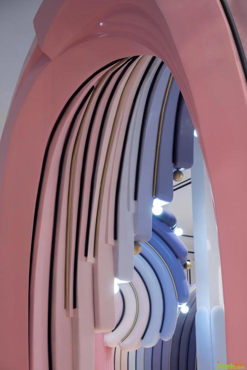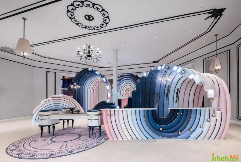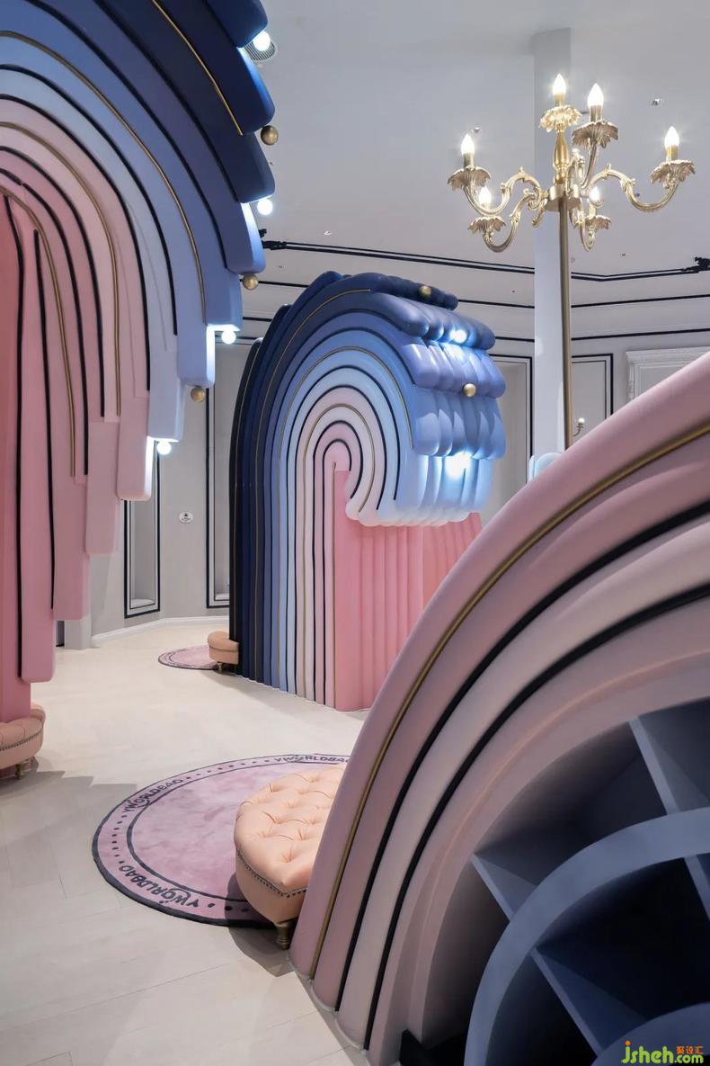 當客人步入接待換鞋區(qū),聆聽眼前海洋的潮汐奏鳴。設計師將功能和美學統(tǒng)籌為整體,藝術性地提煉浪花元素演化為鞋柜與服務臺。樂園設計形如彩虹的甜美浪花在室內翻騰,堆疊出瑰麗的海面,以多功能L形前臺為中心的單向動線串聯(lián)了接待區(qū)和零售區(qū),并激活服務臺對雙區(qū)的服務屬性。
