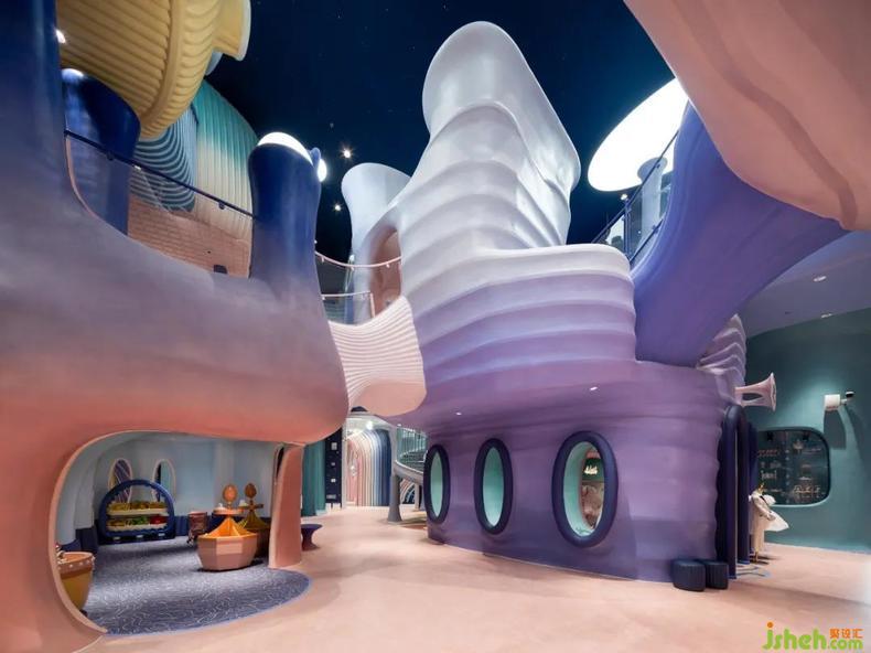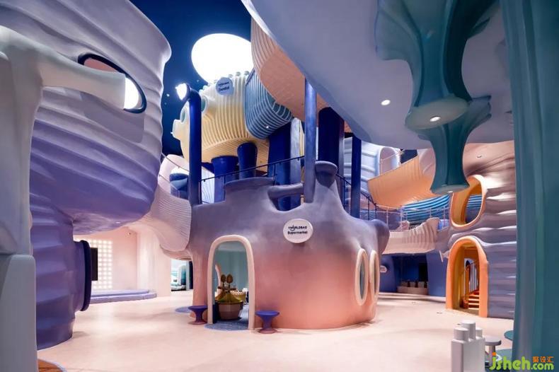 樂園設計抽象出珊瑚的形態(tài),再重構為一座座爛漫的珊瑚房子,彼此連結,簇集為千姿百態(tài)的珊瑚礁樂園。天花板上的夜空星光安靜灑落,珊瑚悄然呈現(xiàn)著夕陽余暉下漸變的多彩。高約十米的模擬城下,設計師打造出一場屬于深海的神秘盛會,孩子們沿著流暢的動線穿梭于立體層次豐富的模擬城,如一只只漂浮在珊瑚礁中的小魚,探索眼前應接不暇的新奇風光,體悟海洋作為生命搖籃的偉大。