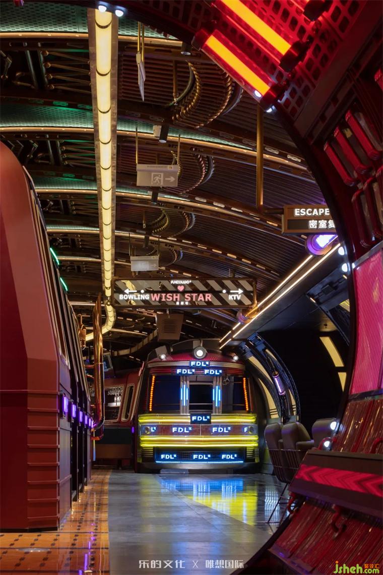 入口的黑鏡墻面上,裝修設(shè)計(jì)拱形門洞內(nèi)顯露出一個(gè)光怪陸離的世界,如同穿越進(jìn)動(dòng)畫里的虛構(gòu)宇宙,幾輛“盜夢列車”交錯(cuò)著迎面駛來,帶來強(qiáng)烈的超現(xiàn)實(shí)場景錯(cuò)位感。