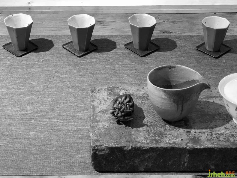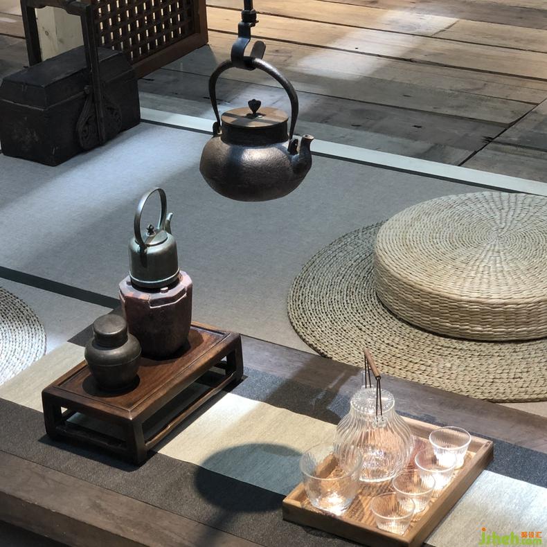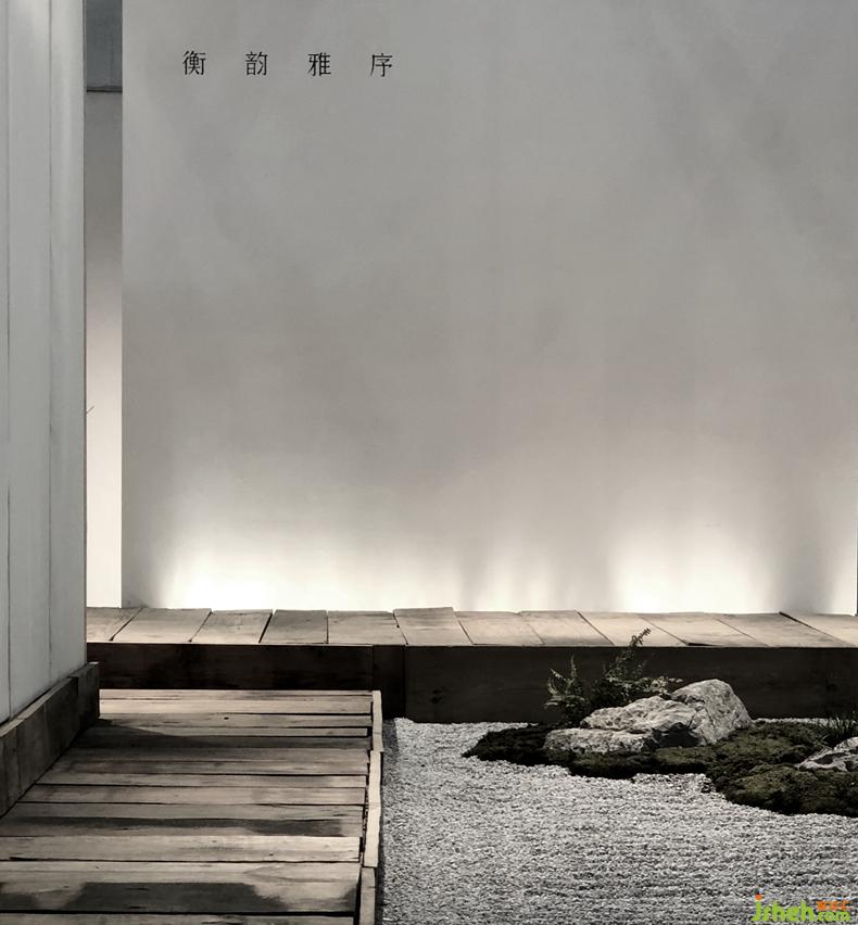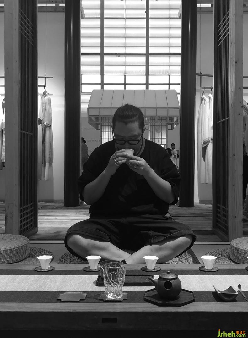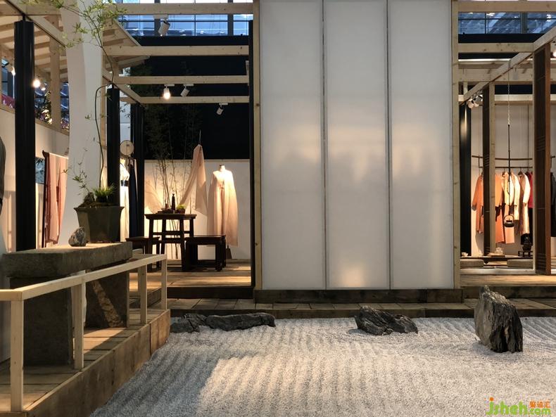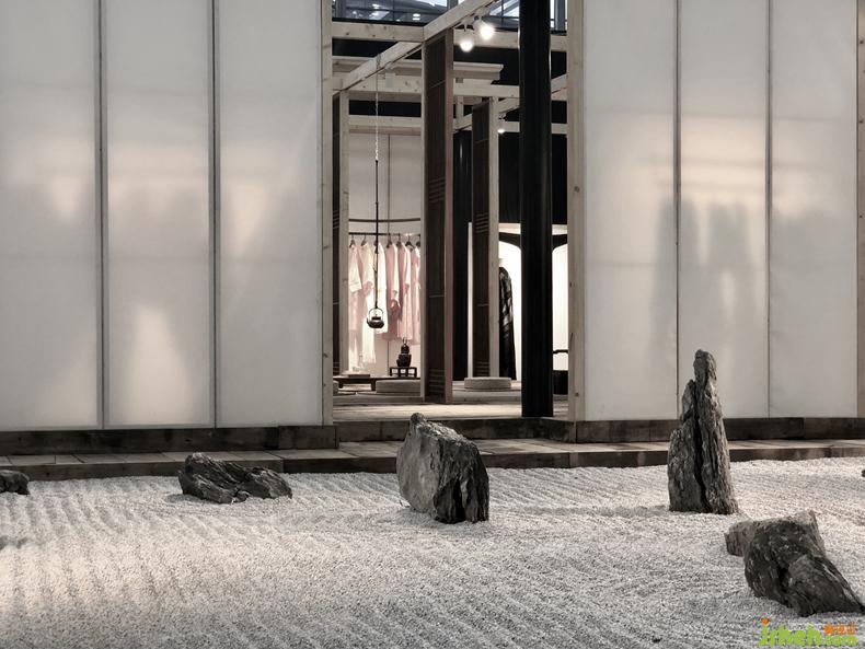 從石庭穿過透光屏風(fēng)后呈現(xiàn)的是更加純粹的東方文化情境,筆墨茶煙,青苔蒲草處處有情,面面生意,余味不盡??臻g軸線上對應(yīng)的長條屏風(fēng)既分割空間又留有余地,席地茶席的布置器物樸雅有妙韻,自成佳景。衡韻雅序陳列的錦繡羅衫于此情境中已然是無需任何渲染的一種靜態(tài)藝術(shù)。