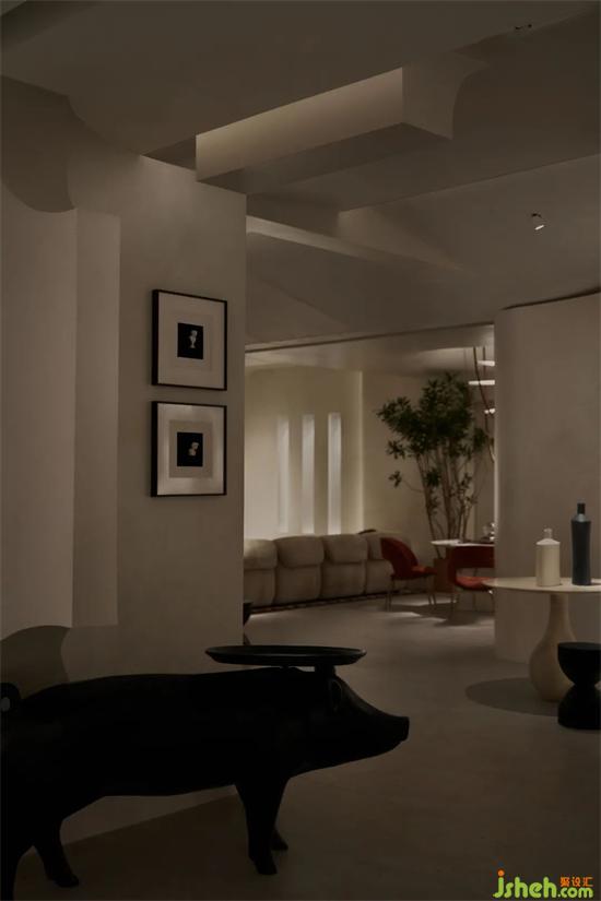 為了讓客人穿過前廳后能對(duì)后場(chǎng)區(qū)域繼續(xù)保持新鮮感,我們?cè)贚iving和Art展廳區(qū)域交界處創(chuàng)作了一個(gè)裝置性的藝術(shù)通道,人們會(huì)被這個(gè)內(nèi)建筑所吸引,具有吸引力的弧形墻體能讓展廳瞬間轉(zhuǎn)換空間情緒,神秘感油然而生,一步一步打開客人的好奇心,家居館設(shè)計(jì)后場(chǎng)濃郁的藝術(shù)氛圍會(huì)讓人心情愉悅,浪漫感油然而生。