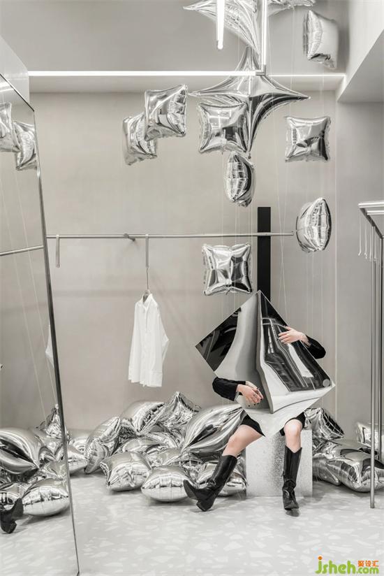 在轉(zhuǎn)角處,漂浮著被安迪沃霍爾稱(chēng)之為「銀云」的枕頭氣球,旗艦店設(shè)計(jì)寓意著女性無(wú)處不在的閃光點(diǎn)。