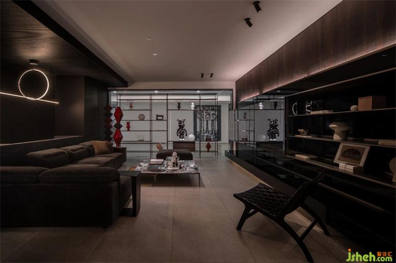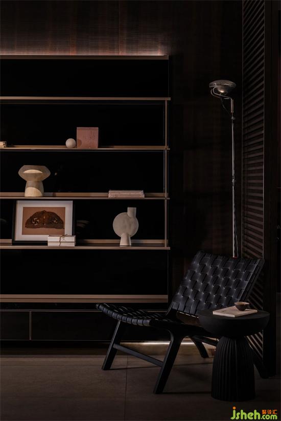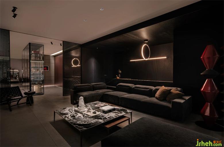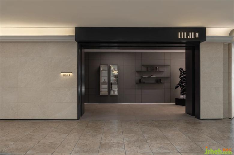 整個展廳歸納為6個空間。以簡潔直白的線條,空靈的的布局,傳達品牌理念、展示產(chǎn)品工藝。前廳為一個全開敞空間, 是展廳的入口和品牌展示界面。門展示區(qū)是進入展廳的第一個展示空間,對景墻左側(cè),是陣列成一排的厘羋門,風格色彩統(tǒng)一,潤舍納圖構(gòu)成了空間的序列感。與之連通的是衣柜展示區(qū),半透明的玻璃柜體,形成了空間朦朧的界線,自然的將人流引導到下一個空間。客廳,兼具產(chǎn)品展示和接待功能,厘羋低調(diào)的LOGO墻前,是水吧區(qū),增加了空間的生活氛圍感,寬敞的意式沙發(fā),質(zhì)感的單椅,營造出舒適卻不失精致的家居體驗。衣帽間對稱的布局方式,讓更衣這件事,變得更有儀式感。與之相對的是辦公區(qū)和選材間,用一扇半透材質(zhì)的推拉門作為隔斷,在工作的同時,可以留意到店的客人。