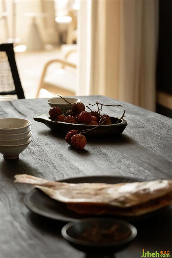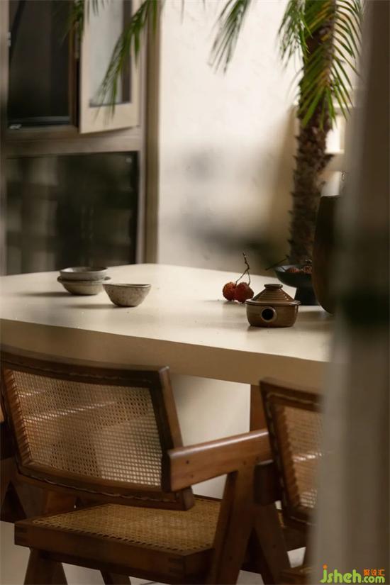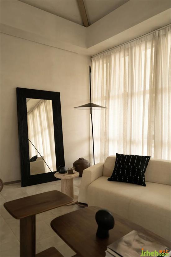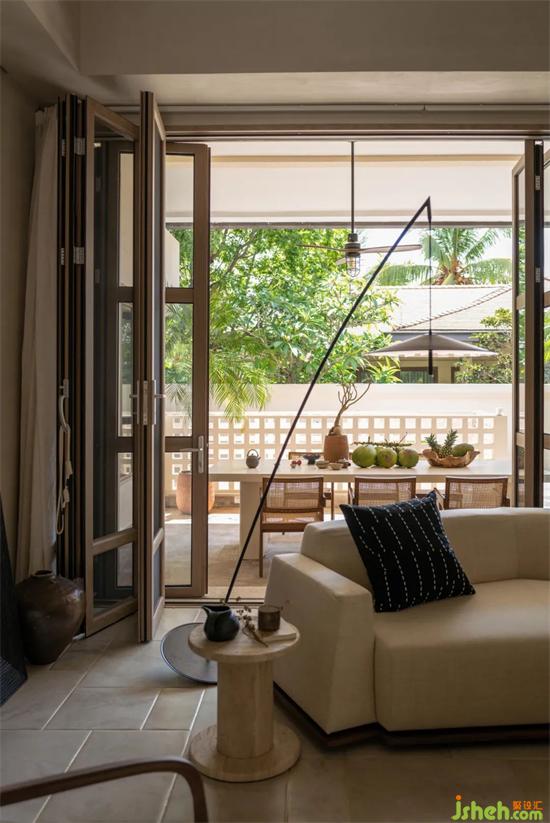 正對客廳用推拉式全開玻璃門讓客廳與院落隨時聯(lián)通,順著海風將椰林的香氣帶入室內(nèi)。房間內(nèi)保留了大面積的玻璃窗,別墅設(shè)計將外景納入室內(nèi),院墻的方格石籬笆讓陽光斑駁地照進來,顯得格外清透。