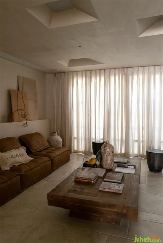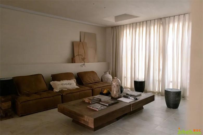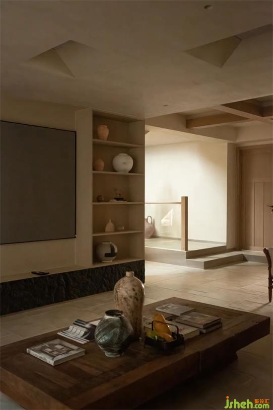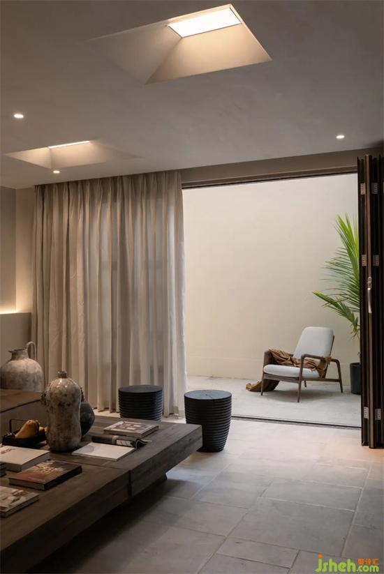 設計團隊將原本計劃設置在樓下的主臥及兩個兒童房盡量靠窗而建,由于取消了原本遮擋院落的實墻充沛的陽光也能通過天井直落各個臥室的窗邊。中間負一樓起居空間雖然增加采光面積但還是略顯不夠,借鑒建筑大師貝律銘大師在美秀美術館實用的頂部開窗形式,別墅設計用燈膜透光仿照開窗引光入室,自然不刻意。