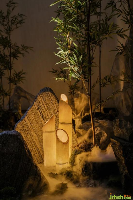 茶道卡座底下怪石嶙峋,竹葉茂密,共同組合成了周邊的山林景觀。茶樓設(shè)計(jì)淺薄真實(shí)山石擬山之高低起伏,山形各異的姿態(tài),從側(cè)邊進(jìn)入到其中,近可觀其中的奧秘,遠(yuǎn)可看世間燈火闌珊。
