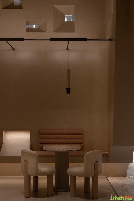 大面積沙色與淺紅砂巖色包裹整個內(nèi)建筑空間,向到訪的客人們最大限度展示“接納”的誠意。會所設計珊瑚色的坐墊,散落著粉水晶般的水磨石桌面,的好像暗藏在女性靈魂中,不會隨時間消逝的浪漫與溫柔。我們在墻壁上鑿出洞窟,將天光捕捉進室內(nèi)。也以建筑材料疊加的方式,模擬出天光乍泄的自然感官。