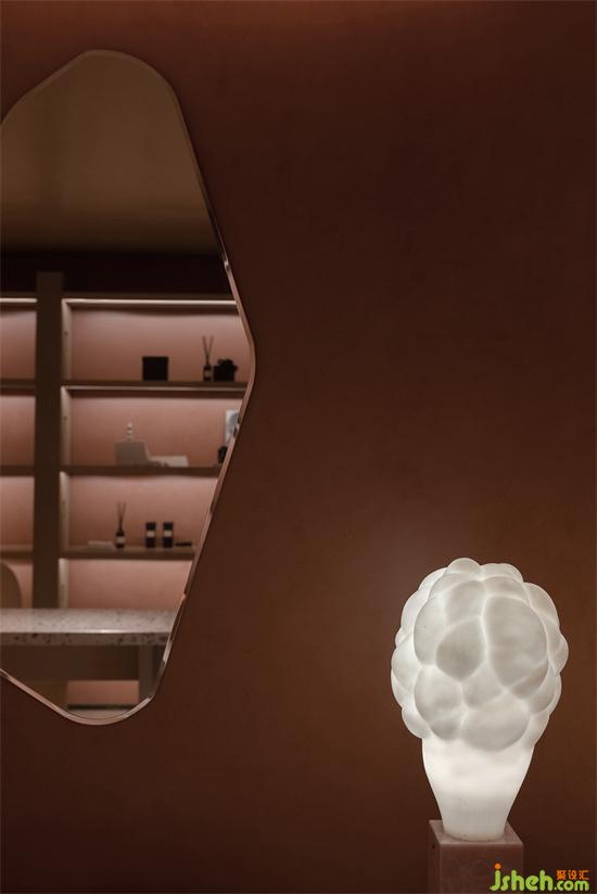 順著觸感細膩又柔軟的地毯,向上行走,去掠過外墻鏤空投進來的日光;會所設計轉交之間,去揉化掉充滿他人想象的妝容,從生活道具的角色扮演中抽離,一個個如在洞穴中鑿出的獨立美容操作空間里,即將上演關乎“美”的短劇。