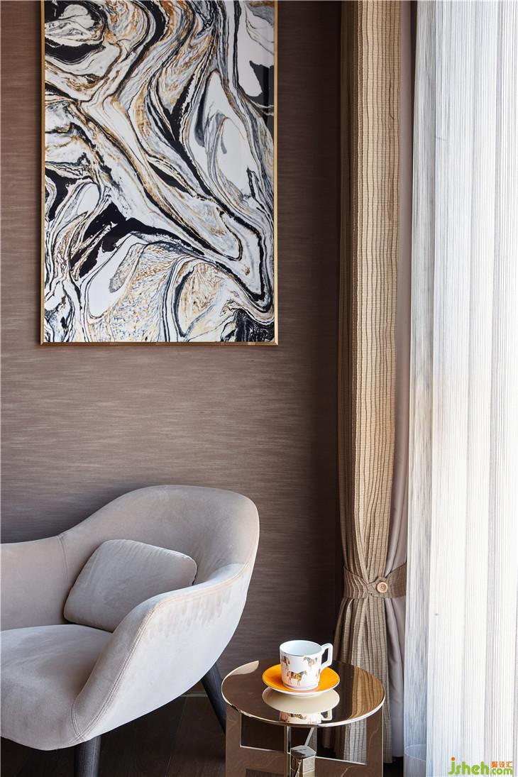 延伸空間生命,構筑人內(nèi)心的精神訴求,是設計之魂。薄紗搖曳的窗臺邊上的minotti絨質單椅,線條優(yōu)雅順暢,在這樣的空間氛圍中獨顯魅力,搭配一幅極具個性的裝飾畫,線條抽象,肆意灑脫,極具藝術肌理,高級感十足,符合現(xiàn)代人的生活品味。