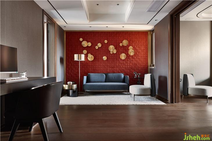 設計的樂趣,在于用特殊的手法,產(chǎn)生眼前一亮的設計語義,關照所有感官,凸顯空間調性。超大主臥套間里的書房,空間布局與色彩搭配,渾然天成。整體的家具結構傾向簡約,自帶時尚質感的紅色絨皮沙發(fā)背景墻,讓人眼前一亮,為整個空間增加了摩登范。