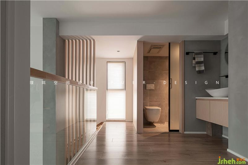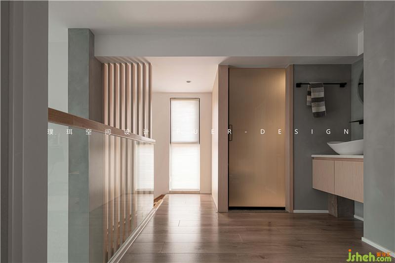 主臥與挑高區(qū)以玻璃為隔墻,延伸出空間通透的視覺(jué)感。